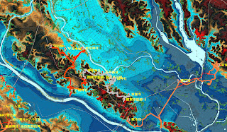 堤防から遠くに見える印象的な山容は筑波山であろう、か。また、右手を見ると、南東へと下ってきた小貝川が北東へと流路を変えるその先に、小貝川の流れを堰止める岡堰も見える。小貝川が大きく流路を変え、水勢を抑えた「溜まり」のその先を選んで堰をつくったように思える。