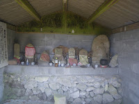 ブロック造りの祠に祀られる石仏にお参り。「えひめの記憶」によると、祠には見送大師が祀られると言う。