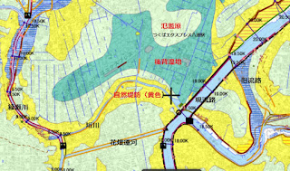 八潮市の「治水地形分類図」を見ていて、ちょっと気になることが出てきた。中川筋が現在の流れとは異なり八潮市の潮止橋の上流から南に流れ、現在の大場川に合わさる旧流路が描かれる。通常行政境界は山や川筋で区切られることが多い。確認してみると、現在の中川左岸、旧流路と現在の流れに囲まれた古新田地区は八潮市となっていた。