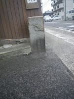 古い資料に拠れば、ルート目安となる標石は琴平電鉄長尾線歩行者踏切を渡ったところにあるとのこと。成り行きで道を進み右折・左折を繰り返し線路脇の道筋に出る。道を東に進み琴電の歩行者踏切を渡ると標石があった。