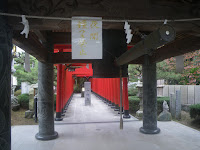 裏参道の赤い鳥居を左折すると、今度は中央にさぬき獅子を置く北参道。ここも赤い鳥居が続く。参道を進み正面に七福神巡り、弁天社、宮島社を見遣り右折すると天満宮、素婆倶羅社、宇都伎社、本殿と続く。