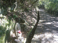 道の左右の未舗装箇所には結構な数の車が停る。屋島寺なのか屋島のお山なのか、ともあれ車をここまで寄せて屋島へと向かうようだ。道はその先で石段となる。