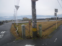弧を描く道を県道に戻ると合流点に壊れた石造物が集められそこに4基の標石が見える。