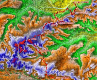 行く前に地図をチェック。平山城址公園のそばに長沼公園がある。またその西には野猿峠・野猿街道が走っている。さらにその西南には「絹の道」のマーク。横浜開港時、八王子で集めた絹を横浜まで運んだ道筋とか。絹の道って、多摩の歴史などを読んでいると、しばしば登場するキーワード。いい機会なのでそこまで足を伸ばすことにした。距離は10キロ程度。が、カシミール3Dでチェックすると、結構なアップダウン。多摩の丘陵を登ったり降りたりの散歩となりそう。少々膝に不安を覚えながらも、まずは最初の目的に京王線平山城址公園に向かう事にした。