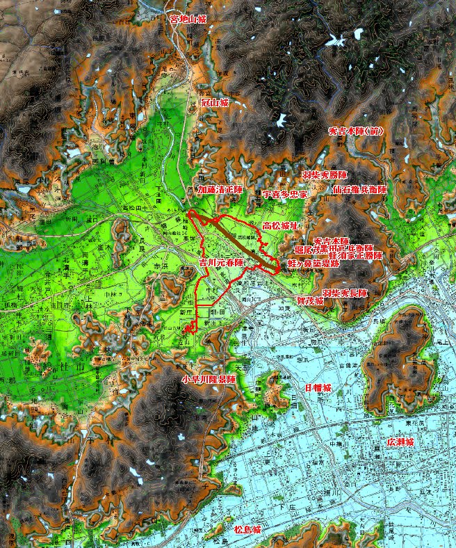 秀吉は諸城を次々と攻略し、最後に残ったのが備中高松城。秀吉は高松城の城主清水宗治に利をもって降伏するよう勧めたが、義を重んじる宗治はこれに応じなかった。高松城は深田や沼沢の中にかこまれた平城で水面との比高がわずかに4mしかなく、人馬の進み難い要害の城であった。攻めあぐねた秀吉は参謀黒田官兵衛の献策に戦史にも稀な水攻を断行、兵糧攻の策をとる。秀吉は、備前国主宇喜多氏の家臣千原九衛門勝利を奉行とし、3キロに及ぶ堤もわずか12日間で完成させた。時あたかも梅雨の頃で、増水した足守川の水を流し込み、たちまちにして188ヘクタールの大湖水ができ、城は孤立した。(「この地図の作成にあたっては、国土地理院長の承認を得て、同院発行の数値地図50000(地図画像)数値地図25000(数値地図),及び数値地図50mメッシュ(標高)を使用した。(承認番号 平22業使、第497号)」)