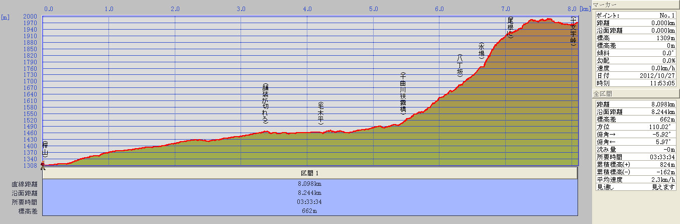 「八丁」は「八町「」。およそ872m。「八丁」は「胸突き八丁」から。元は富士登山で頂上近くの険しい八丁の道から、とか。それが富士以外の山でも使われるようになった。先日歩いた四国札所44番の大宝寺から45番の岩屋寺に辿る山道にも「八丁の坂」と呼ばれる険しい山道があった。
