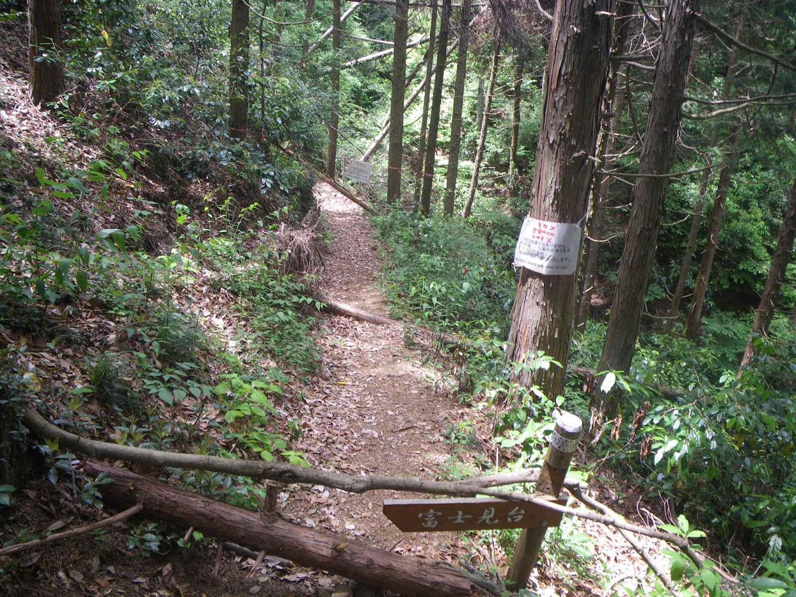 富士見台で富士山の眺めを少し楽しみ、休憩することもなく富士見台の直ぐ傍の「陣馬山縦走路分岐点」を右に折れ、詰の城へと向かう。分岐点には「荒井バス停2.7キロ 堂所山(6キロ)・明王峠(7.2キロ)・陣馬山(9.1キロ)」の道標がある。