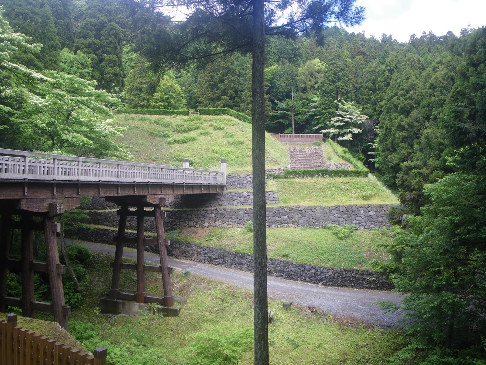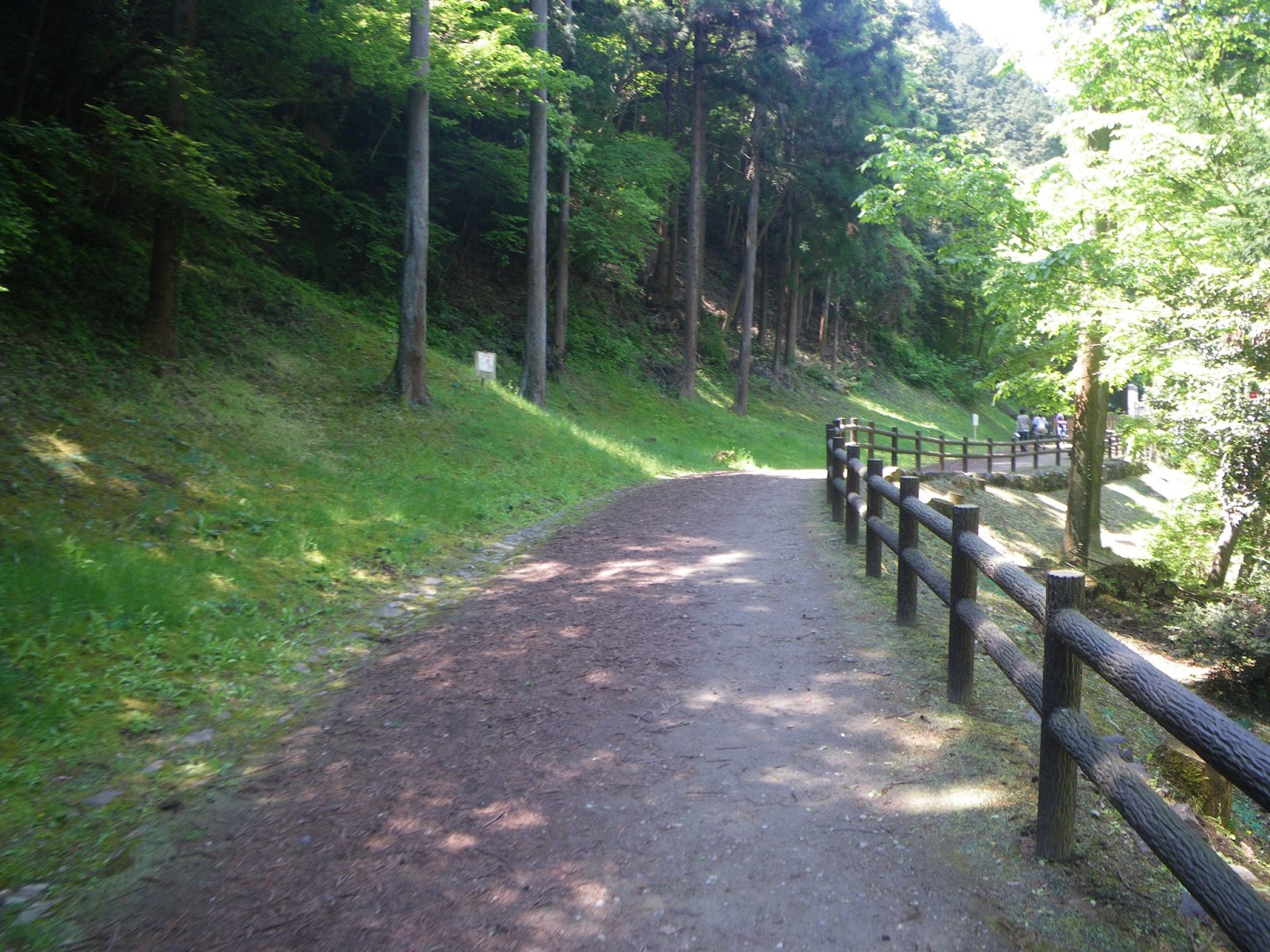 曳橋を渡り、きれいに整地された大手道を下る。右手の太鼓尾根は先ほど堀切や太鼓曲輪を辿ったところであるなあ、などと想いを巡らしながら山腹中腹の道を下る。道を下り切り、城山川方面へと道が曲がる辺りに木の柵があり、大手道はここで終える。木の柵の脇にある案内には、;「大手道 発掘調査では、当時の道は明確にできなかったが、門跡や橋台石垣の検出、さらに平坦部が尾根の中腹に連続していることから、ここが御主殿にいたる大手道であったことが明らかになった。 現在の道は、この地形を利用して整備したもの。当時は、ここから城山川の対岸にアシダ曲輪や御主殿の石垣、さらに城山の稜線にそって連なる曲輪や建物が見わたせたと思われる」、とある。