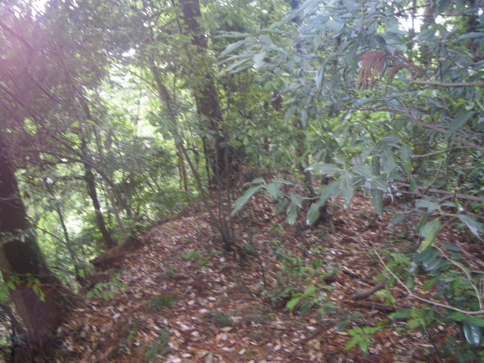第三堀切から少し進み、御霊谷の城山病院辺りから続く長尾根と交差するあたりのちょっとした平坦地に太鼓曲輪があった、とのこと。平坦地の幅は10m程度であり、それほど多くの兵士が詰めれるようにも思えないのだが、太鼓尾根全体の防御陣地を指揮する指令所でもあったのだろう、か。単なるも妄想。根拠なし。