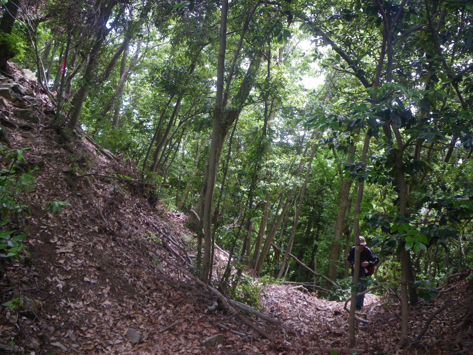 木々に覆われた緑の尾根道を進むと、竹林のトンネルが現れる。いつだったか歩いた旧東海道箱根越え・西坂を三島に下ったときの笹竹のトンネルを思い出した。270mピークの「じゅうりん寺山」を越え、ゆるやかなアップダウンを繰り返し尾根道を進む。じゅうりん寺山から北西に進んだ尾根道が南西へと向きを変える辺りの254m地点に「見張台」があったとのことだが、素人には遺構などはわからない。