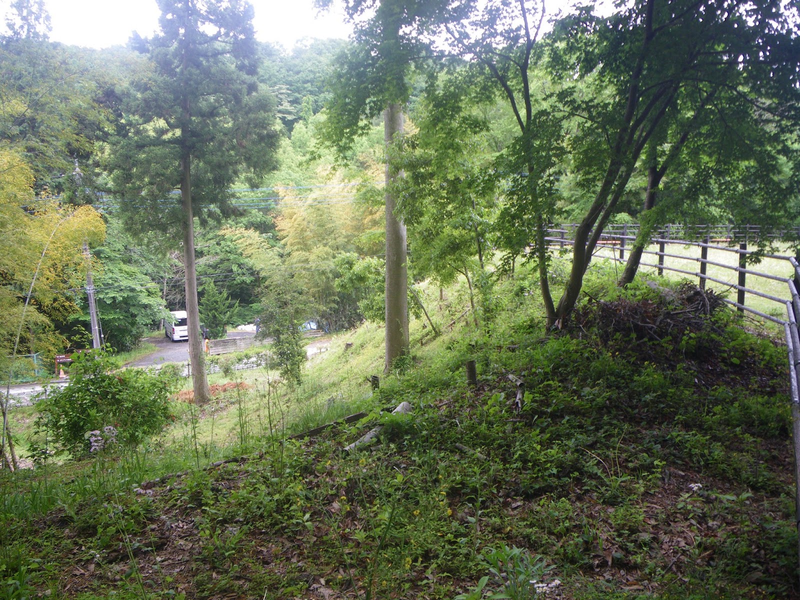 現在大手道は、この場所から御主殿跡に向かって整備されているが、既にメモした通り、往昔は、太鼓尾根の南側の御霊谷側に大手口があり、そこから太鼓尾根の東端、現在は中央高速により分断されている「上の山」に上り、太鼓尾根の北側(城下川側)の丘陵中腹を城下川に沿って続き、この地まで続いていた。