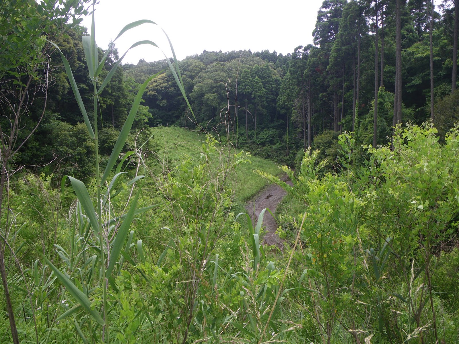谷に沿って道があるのかと思っていたので、宅地開発の端に出てしまい少々途方に暮れる。とりあえず道に沿って東へと進むと道路から直角に谷方向に下る小径。草に覆われた小径を進むと眼下に谷頭といった景観が現れる。ここから湧水が湧き出るのか、それとも先ほどの谷筋からの湧水が集まる一帯なのか、宅地開発のために人工的に造られたものなのか不明ではあるが、ともあれ鹿島川(実際は村田川なのだが、このときは鹿島川と思い込んでいた)の源流点はこの辺りだろうと一安心。後は、この谷頭部から谷筋をひたすら下ればいい、と。