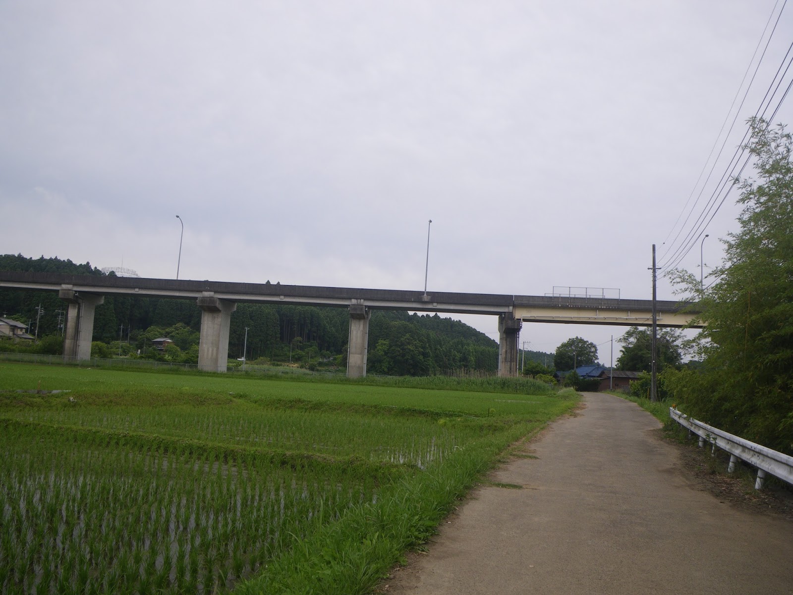 仕方なく丘陵中腹を走るバイパスに上るルートを探すがそれらしき道はない。結局道なき崖面を力任せに上りバイパスに。川に架かる新大椎橋から下流の村田川筋を眺めるに、川の右岸には畑地となっており道はなく、左岸に道が通るだけであった。どうしたところで右岸は進むことができなかったようである。