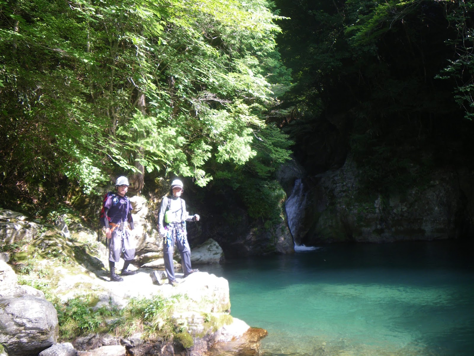 浅瀬の小滝を上り、滑床、大岩に挟まれた浅瀬を進み岩場を下る小滝を這い上がり、3m級の滝をクリアすると大滝が現れる。