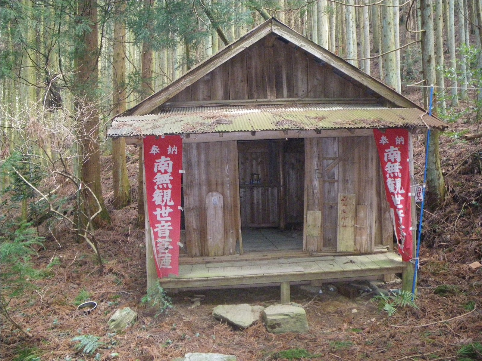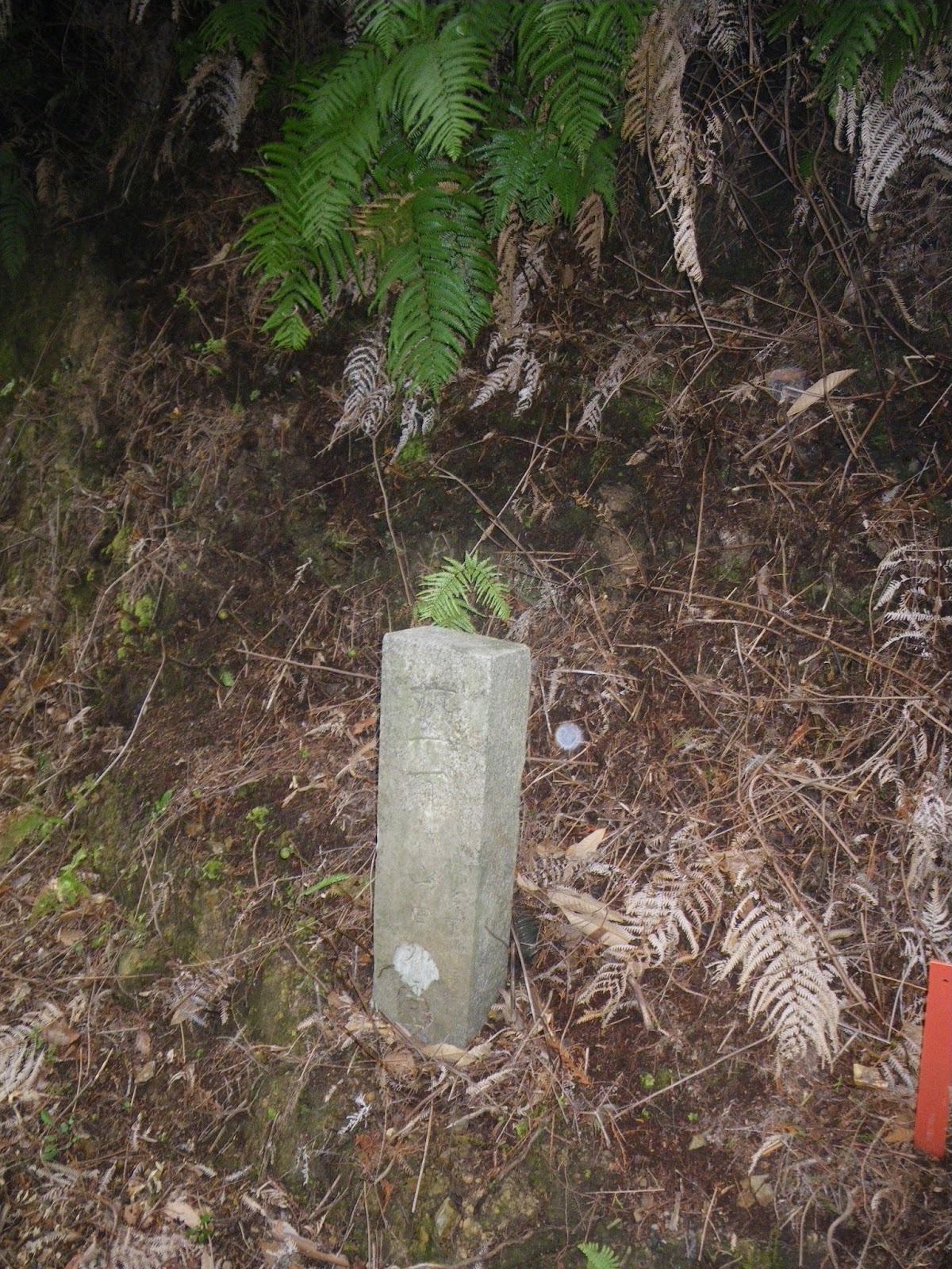 台地上は結構大きな車道。先ほど歩いた高蔵寺前を通る道筋である。道を北に戻ると熊野神社。少し先に東に入る細路がある。とりあえず入って見る。先に進むと畑地に当たる。畦道といった風情の踏み分け道を進むと杉林の中に。更に進むと神社の祠