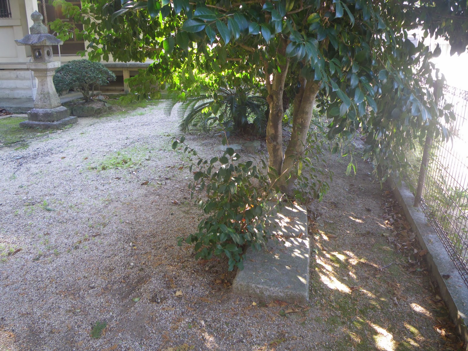 用水フリークとしては、この最後のフレーズにフックがかかり、境内を探すことに。境内の中、薬師堂の表や裏を探す。確証はないものの、それらしき生垣の木立の中に見つけた。石を見てもよくわからないし、上のメモでは何のことかさっぱりわからない。あれこれチェックすると「愛媛県生涯学習センター データベース「愛媛の記憶 東予東部 四 扇状地の集落立地」にこの日時計の説明があった。