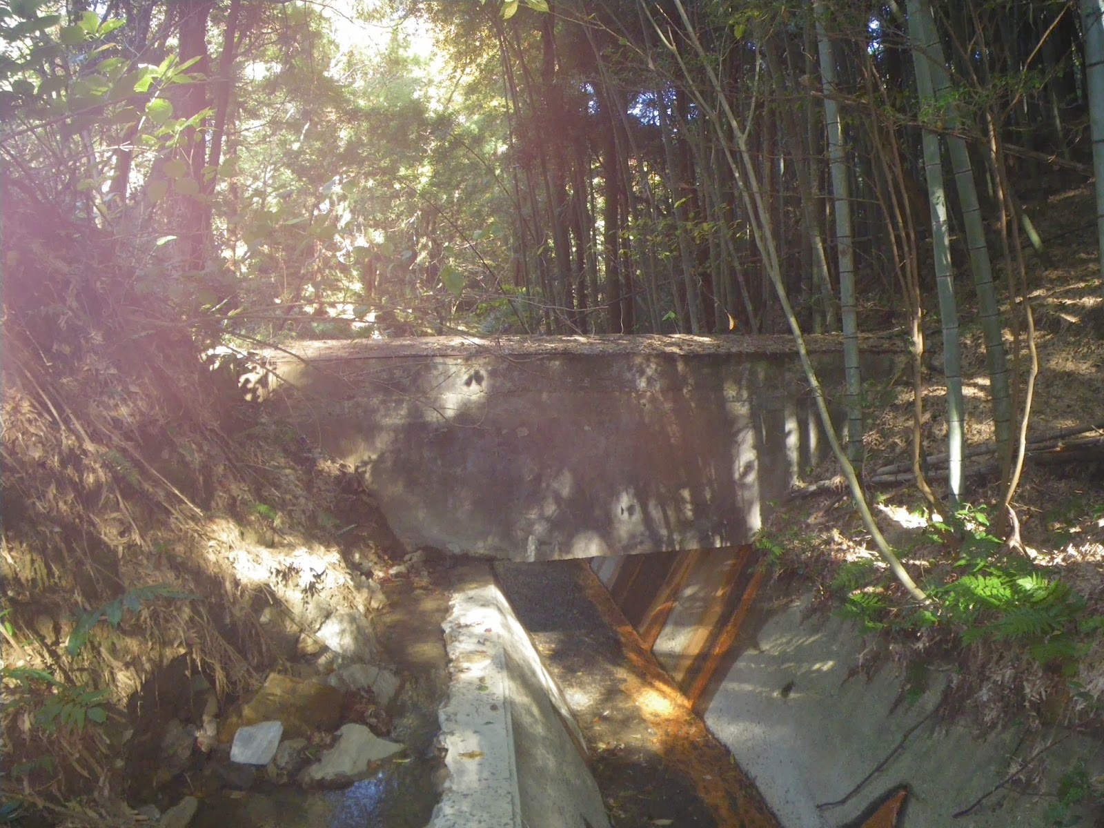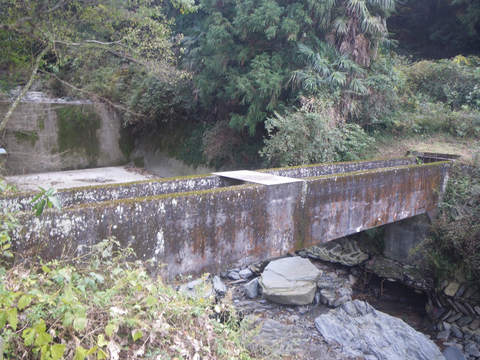 そして、その「減勢水槽」からは発電用の水圧鉄管の東の尾根を下り、地図上で水路のように見える場所を下り、その水路途中から北に真っ直ぐ延びる水路を進み、ほどなく流路を北西に緩やかに曲げ、水圧鉄管をクロスし、クロスし終えたことろから水圧鉄管に沿って少し下り、柱尾分水口から水圧鉄管へと線を伸ばしたところまで続いている。そこが「東西分水工」であり、そこから土居町方面へ伸びる延長約一三・五㎞の西部幹線水路と川之江市方面へ伸びる延長約五㎞の東部幹線水路に分水されることになる、とお教え頂いた。Google Mapで見ると、上記流路に沿ってかすかな痕跡が見てとれる。これでもやもやも消え、そのうちに減勢水槽あたりから下ってみようとも思う。