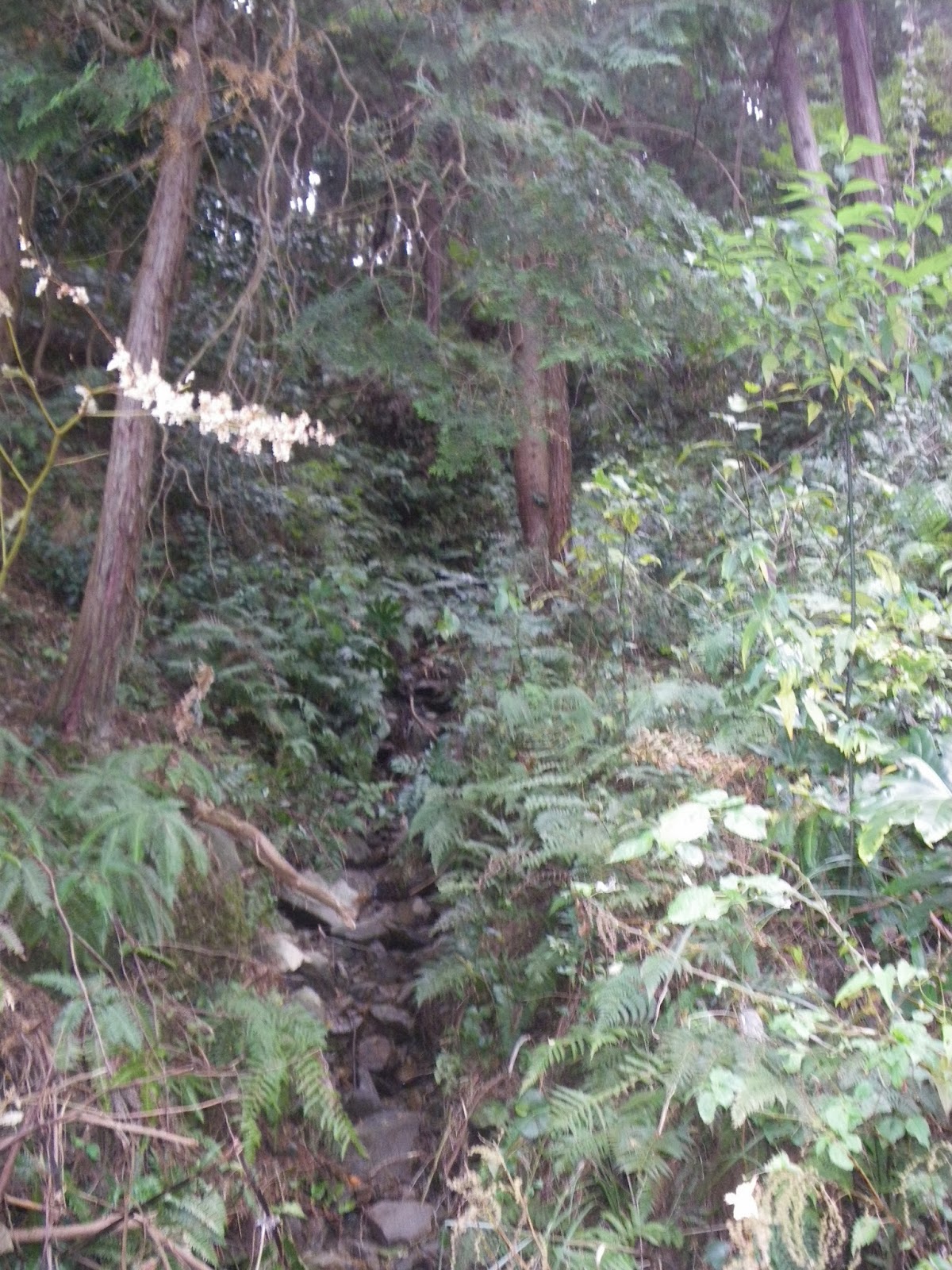 道なりに進み、三島公園に一度上り、公園で楽しむ家族の姿を見ながら沢を探し、三島公園の東端にある公園へ至る車道を下る。と、車道の横に沢が見える。沢筋を注意しながら道を下ると、如何にも水路橋らしきものが目に入った。