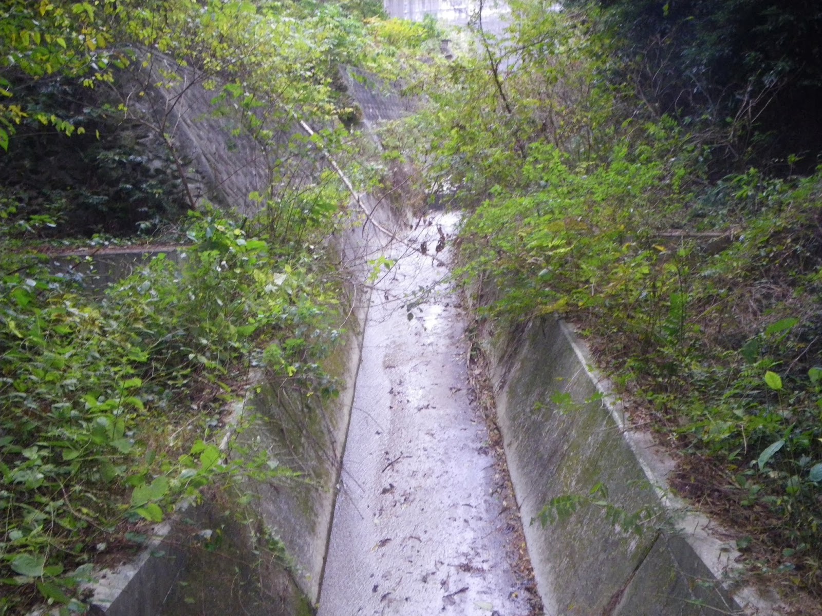 松山自動車道下をくぐり、開渠として続く水路を辿ると樋之尾谷川水路橋に。結構深い谷筋ではあったが、水が流れていない時期でもあったので、用水路の中を歩き安全に川を渡る。