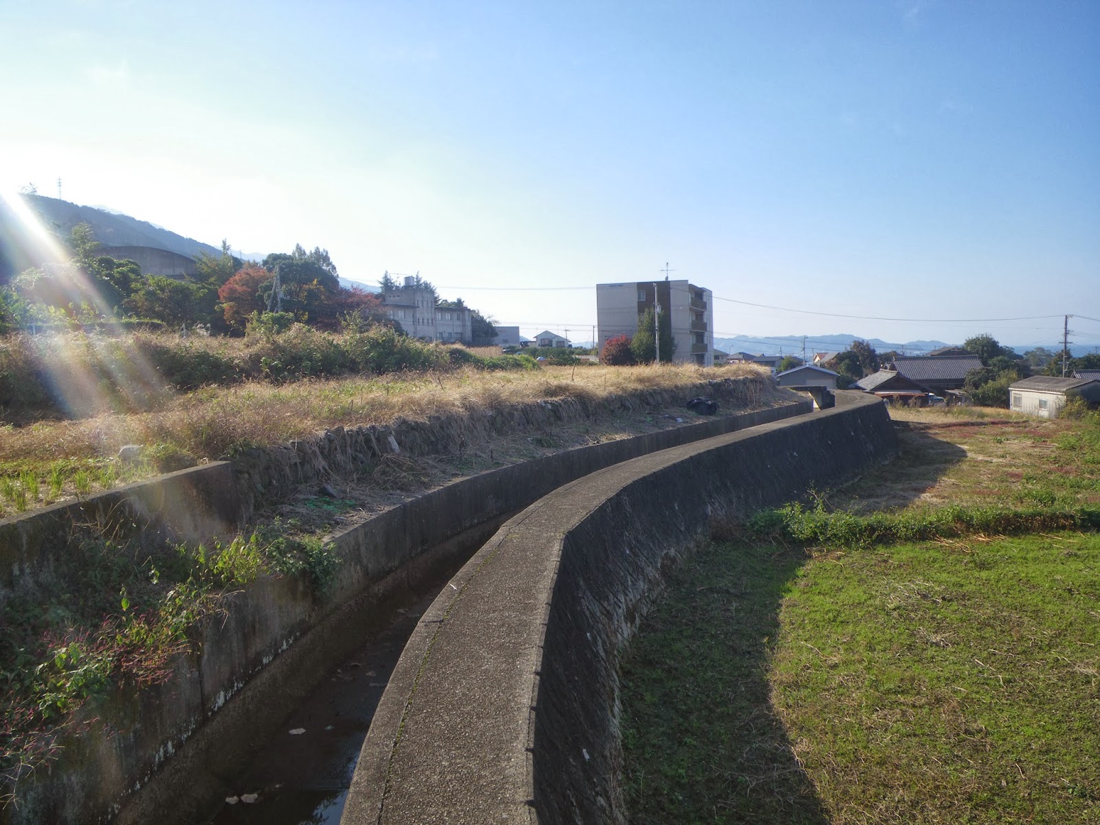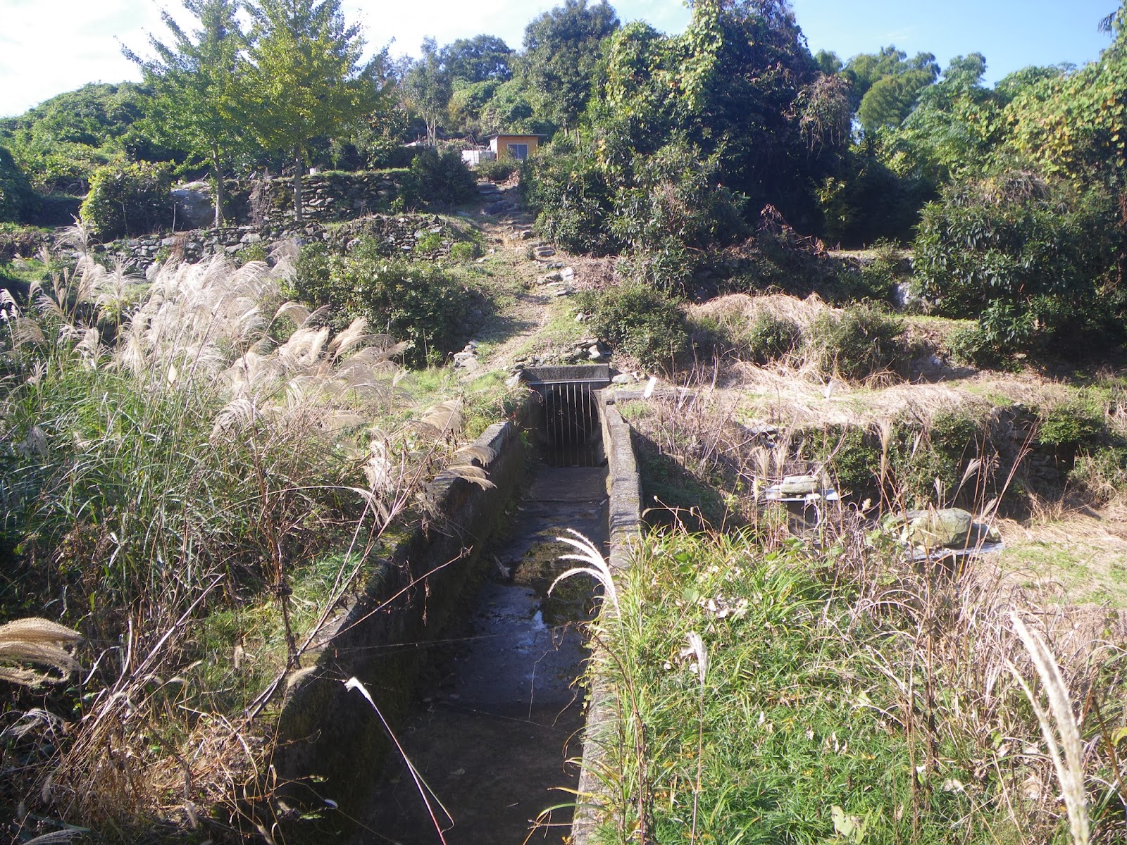 隧道出口を確認し、水路に沿って小広尾川水路橋を越え西へと進む。Google Mapには水路が切れていたのだが、いつ水路が切れるかと思いながら水路に沿って進むと、開渠は切れることなく続きミカン畑の丘の中に吸い込まれていった。
