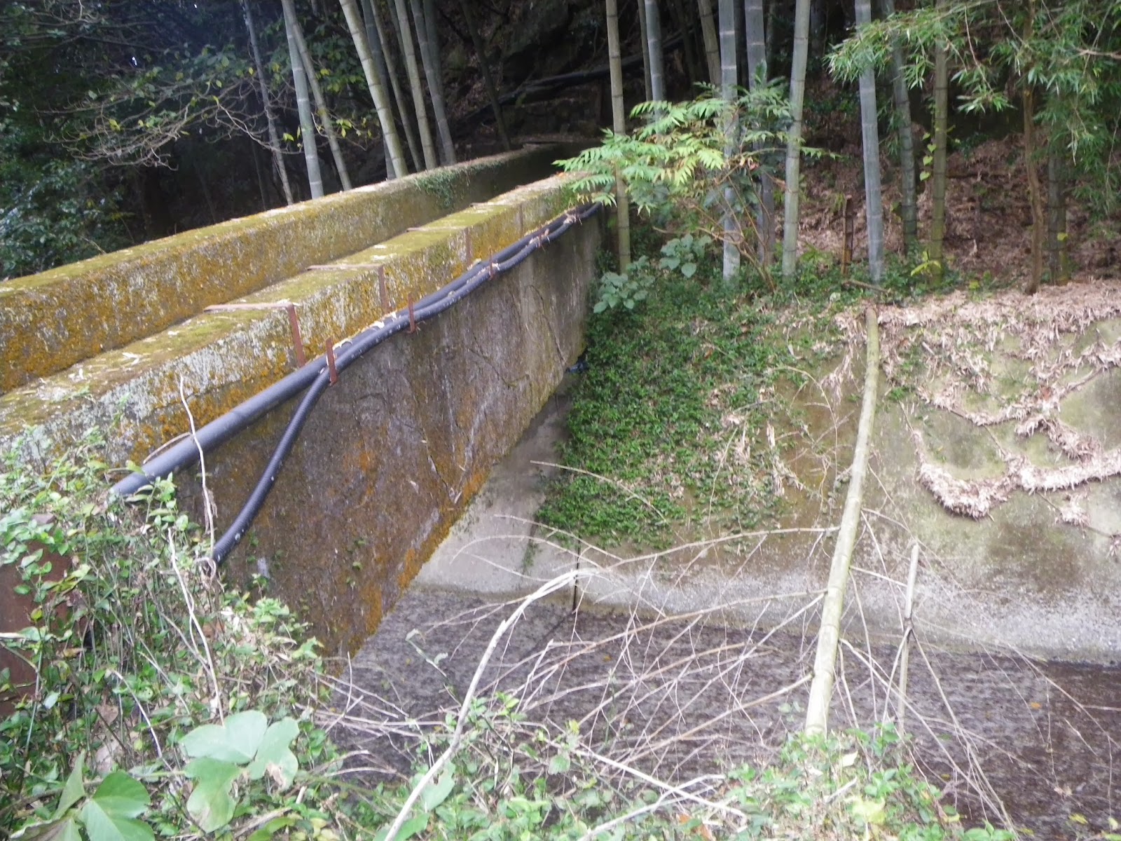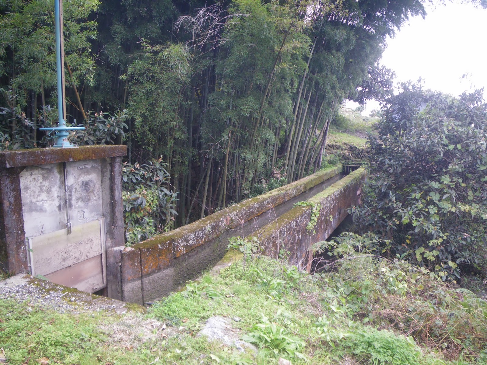 水路の中をミカン畑の中を進み、山裾に沿って用水を辿ると重石川水路橋。対岸には竹林が繁り、趣のある水路橋である。橋を越えると銅山川疏水は地中に潜る。