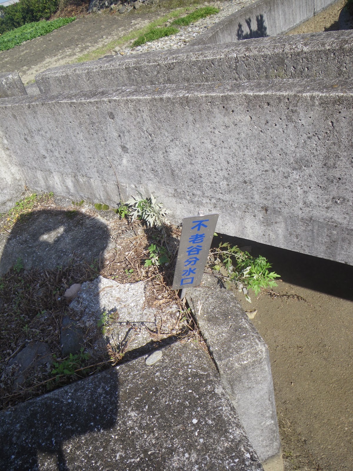 国道から水路をみると橋が架かる。不老谷川水路橋である。その手前には不老谷川分水口と記された標識もあった。水路に沿ってミカン畑の中を先に進む。