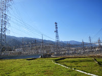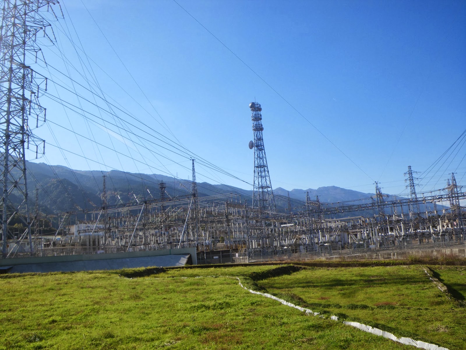 気持ちもよく足取りも軽い。その東中学校の南には四国電力三島変電所。送電線で送られてきた高圧の電気を家庭で使える電圧に変えるところ。四国電力の送電線を見るに、送電線で送られてきた50万ボルトの電圧を土居の東予変電所で18万ボルトに変え、そこから三島変電所まで送電線で送られる。三島変電所では電圧を6万ボルト以下に変へ送電線で6万ボルト変電所のある寒川や川之江に送り、そこから家庭に送電しているようである。