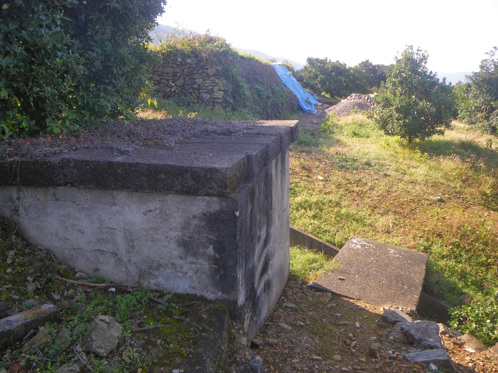 とりあえず松山自動車道に沿って見える水路に向かうことにして、重石川水路橋東詰めから川に沿って道を下る。道の途中には石組みやコンクリート造りの構造物跡が残る。何となく用水に関するような施設跡かと思うのだが、不詳。