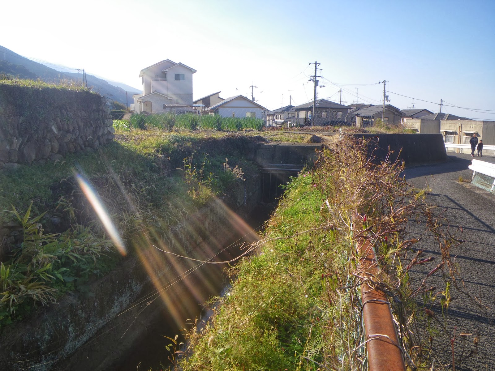 隧道出口を確認し、水路に沿って小広尾川水路橋を越え西へと進む。Google Mapには水路が切れていたのだが、いつ水路が切れるかと思いながら水路に沿って進むと、開渠は切れることなく続きミカン畑の丘の中に吸い込まれていった。