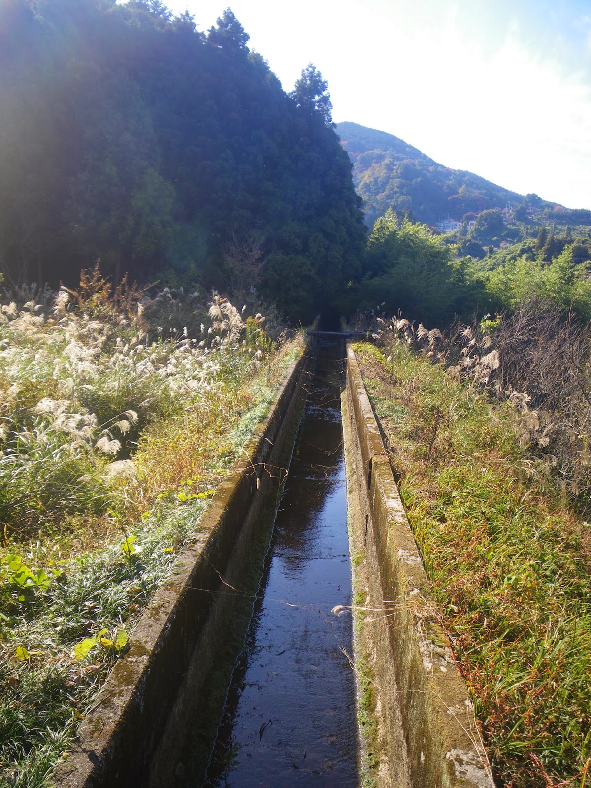 松山自動車道下をくぐり、開渠として続く水路を辿ると樋之尾谷川水路橋に。結構深い谷筋ではあったが、水が流れていない時期でもあったので、用水路の中を歩き安全に川を渡る。
