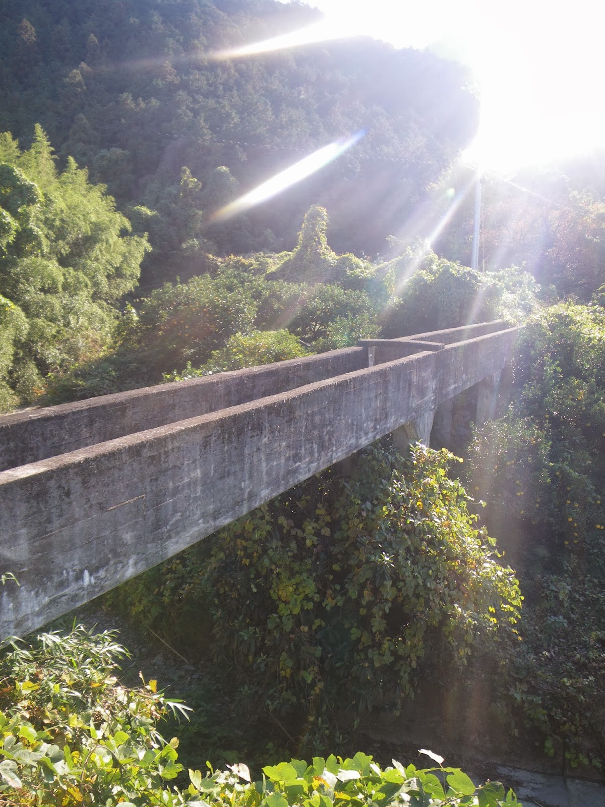 そして、その「減勢水槽」からは発電用の水圧鉄管の東の尾根を下り、地図上で水路のように見える場所を下り、その水路途中から北に真っ直ぐ延びる水路を進み、ほどなく流路を北西に緩やかに曲げ、水圧鉄管をクロスし、クロスし終えたことろから水圧鉄管に沿って少し下り、柱尾分水口から水圧鉄管へと線を伸ばしたところまで続いている。そこが「東西分水工」であり、そこから土居町方面へ伸びる延長約一三・五㎞の西部幹線水路と川之江市方面へ伸びる延長約五㎞の東部幹線水路に分水されることになる、とお教え頂いた。Google Mapで見ると、上記流路に沿ってかすかな痕跡が見てとれる。これでもやもやも消え、そのうちに減勢水槽あたりから下ってみようとも思う。