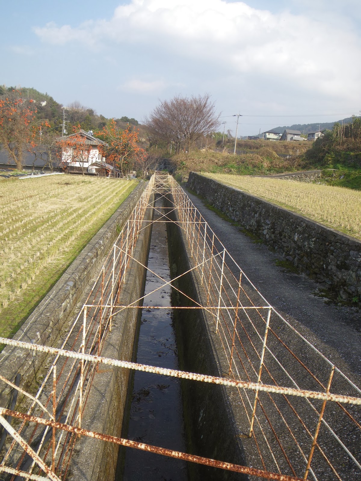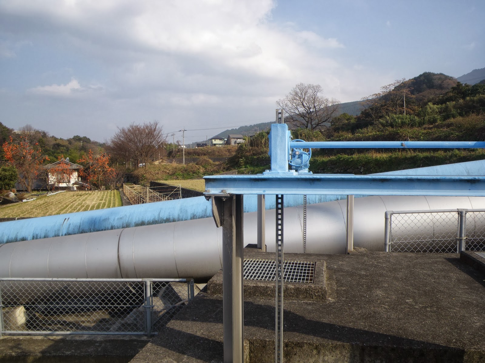 4番目の施設から続く暗渠の先は、ほどなく一瞬ではあるが開渠となる。金網のフェンスに囲まれた水路の先には開閉ゲートがあり、開渠はそこで途切れ再び暗渠となる。この辺りからの里の景観も美しい。