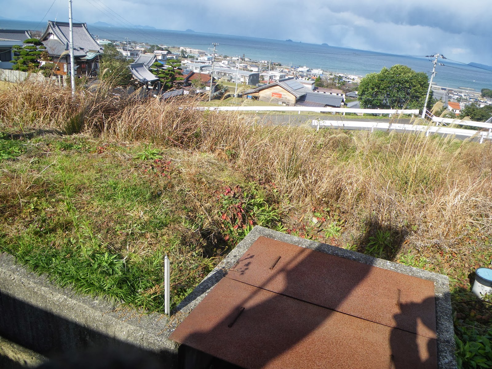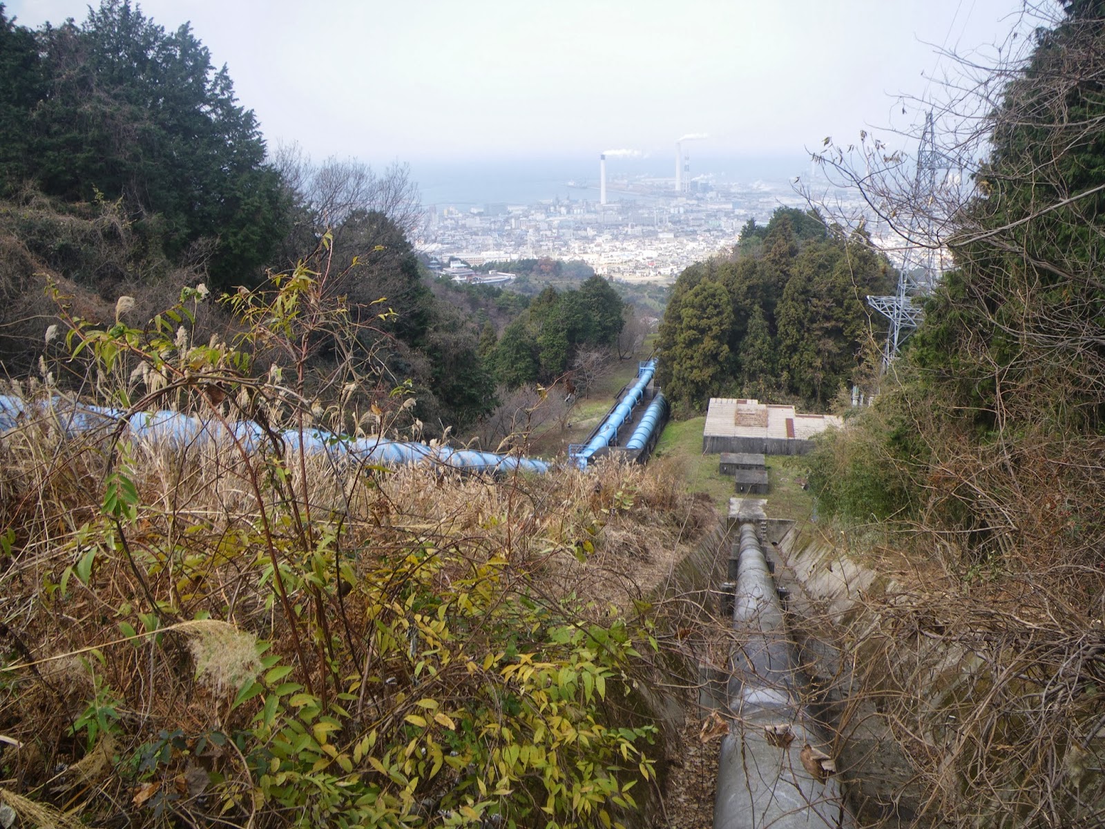 減勢水槽から山腹を見上げ、銅山川の水が隧道から出て3本の鉄管となって下る地点に上ろうと辺りを見回す。と、農業用鉄管に沿って階段がある。階段を上り切ったところで水槽らしき構造物の上に這い上がる。ブッシュが激しく少々難儀したが疏水分流点に立ち、故なき達成感を抱く。堂々として下る鉄管、その向こうに広がる里の景観が美しい。