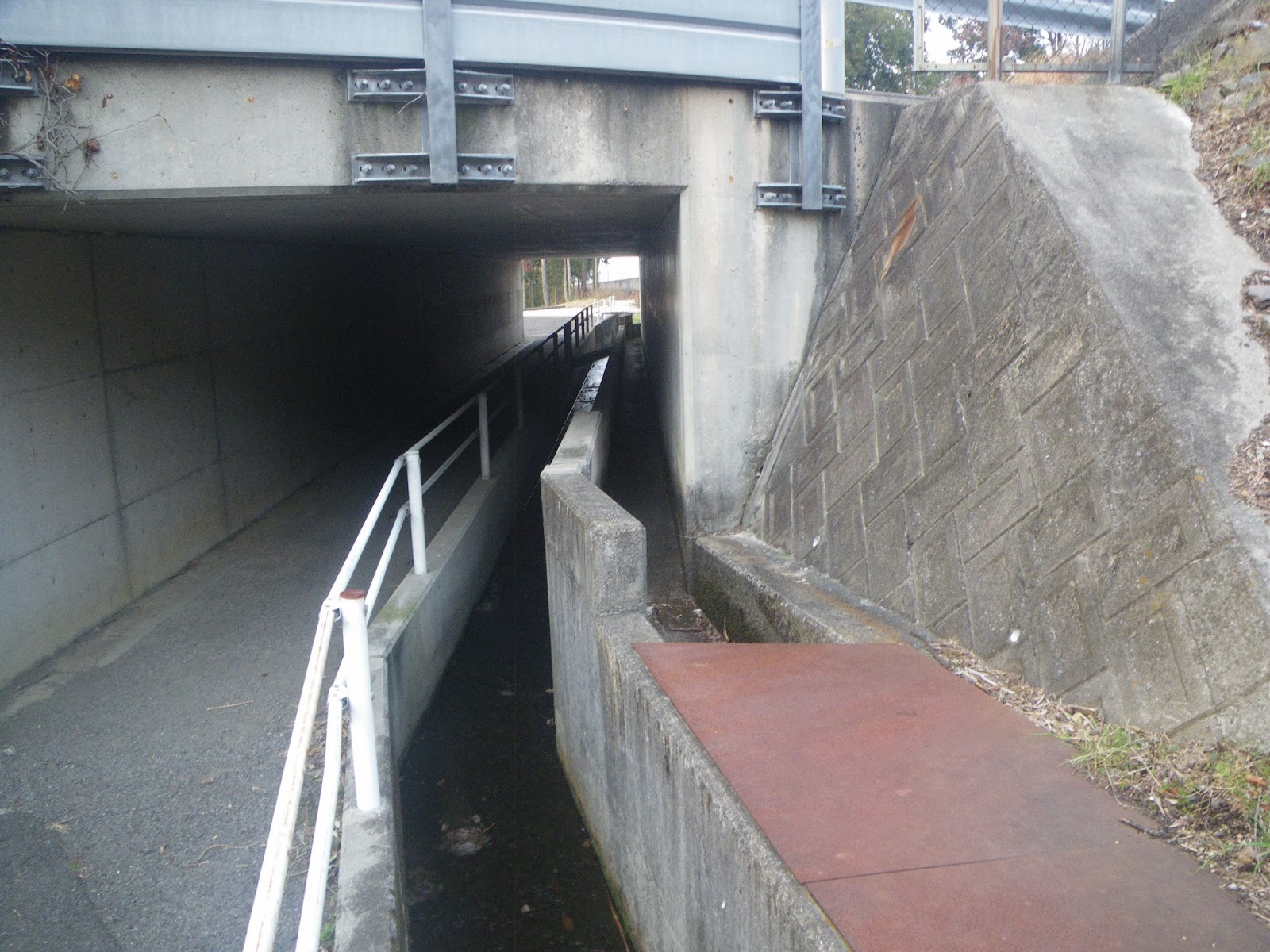 切れ目は簡単に見つかり、整備された道を進むと如何にも疏水施設らしき構造物が現れた。減勢水槽からの水路はこの道の下を通っているのだろう。