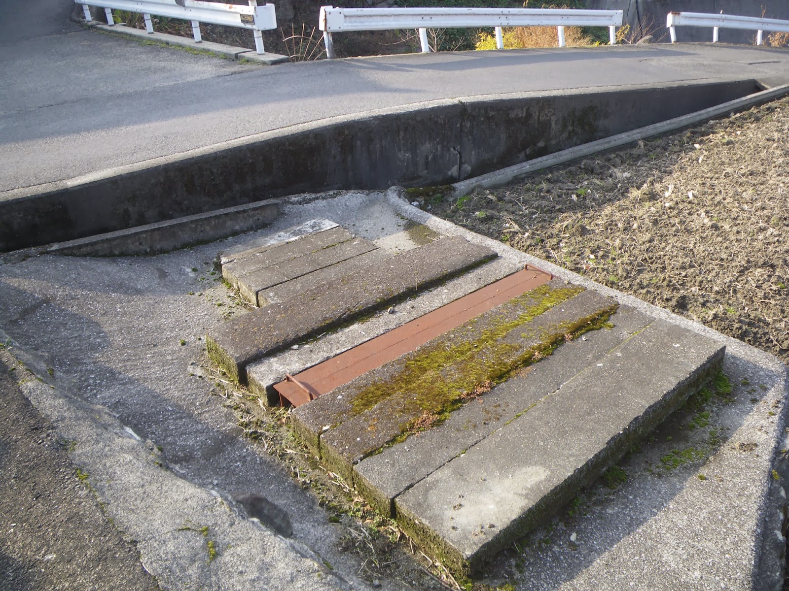 分水口あたりから、教えに従い畑地の脇を進もうと坂を上りはじめると、畑地を横切ったら、と。言葉に甘え畑地を横切り少し西に戻ると民家脇を鉄板で覆われた水路が現れ、その先には川筋を潜るサイフォンらしき構造物があった。細いながらも沢の対岸の民家の脇にもサイフォンのペアらしき構造物も見えた。