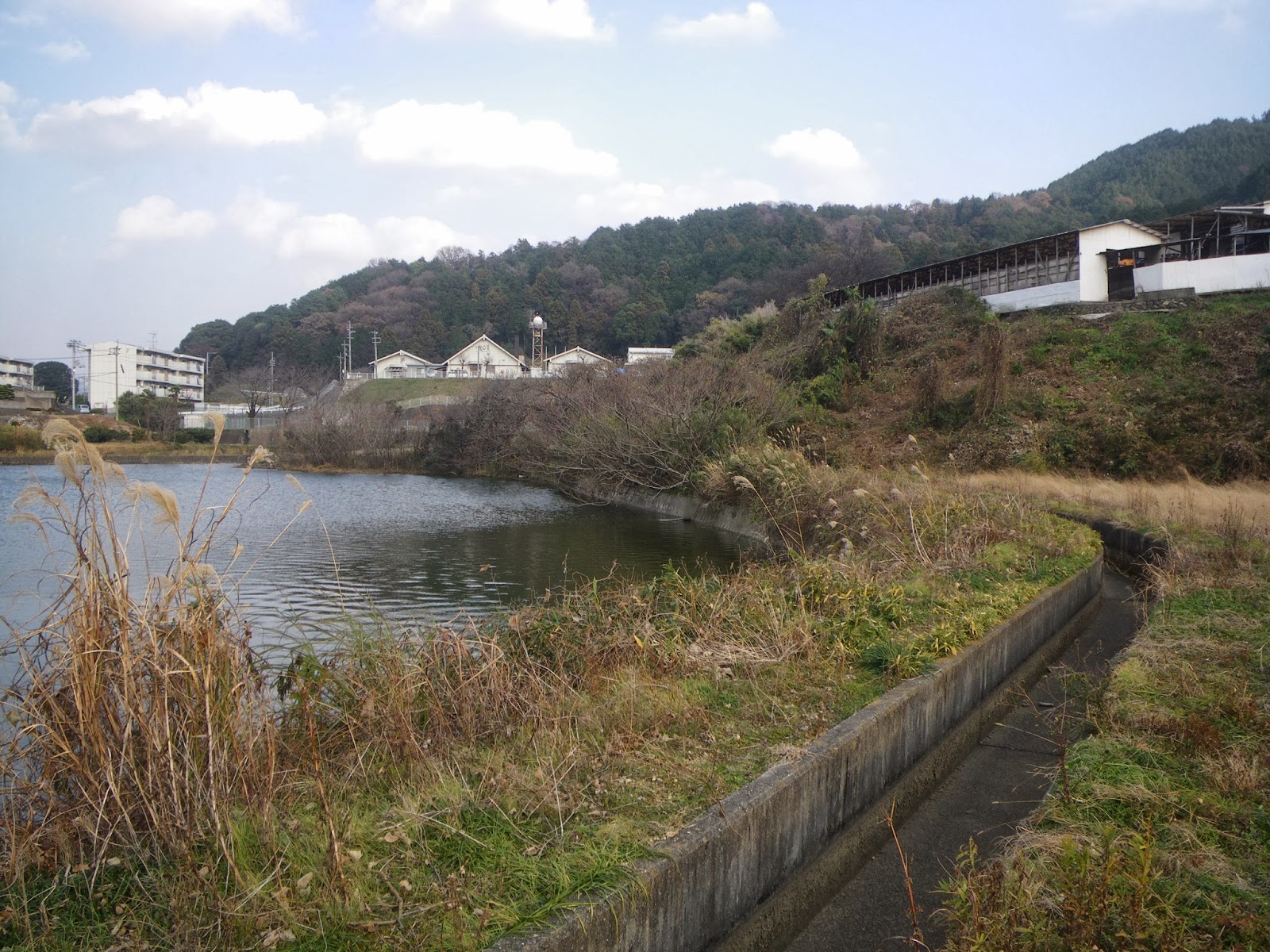 池の北を進む疏水開渠をしばし進む。池に沿って緩やかに曲がる水路の景観はなかなか美しい。しばし進むと暗渠となる。道筋も竹などのブッシュとなるが、それもすぐに開けて開渠となり、池の東を進み、池の東で突起のように東に突き出る池の手前で水路は地中に潜る。