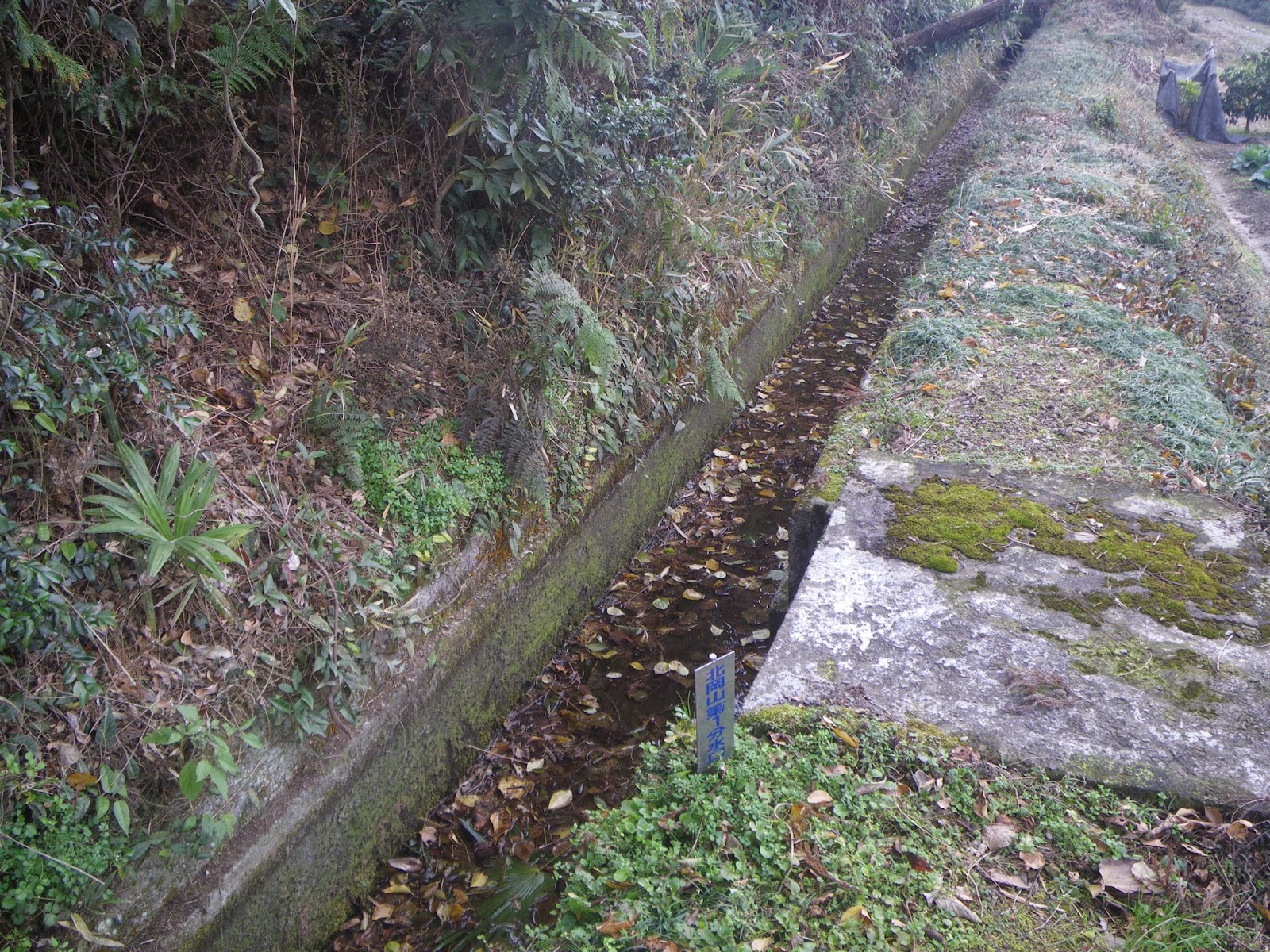 北岡山第二分水口から更に西に進む。段差となった石垣の民家との境となる部分を進むと石の蓋があり、そこに「北岡山第一分水口」の標識があった。水路はその先で地中へと潜る。
