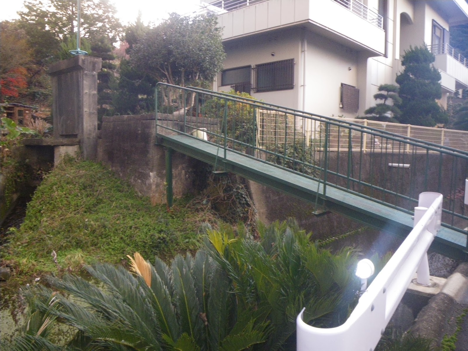 水路を辿るべく先ほど跨いだ水路橋を渡り、水圧鉄管の東側に移り、簡易な鉄の柵に囲まれた水路を進む。が、水路は民家の脇の石垣手前で暗渠となり地中に潜って行った。