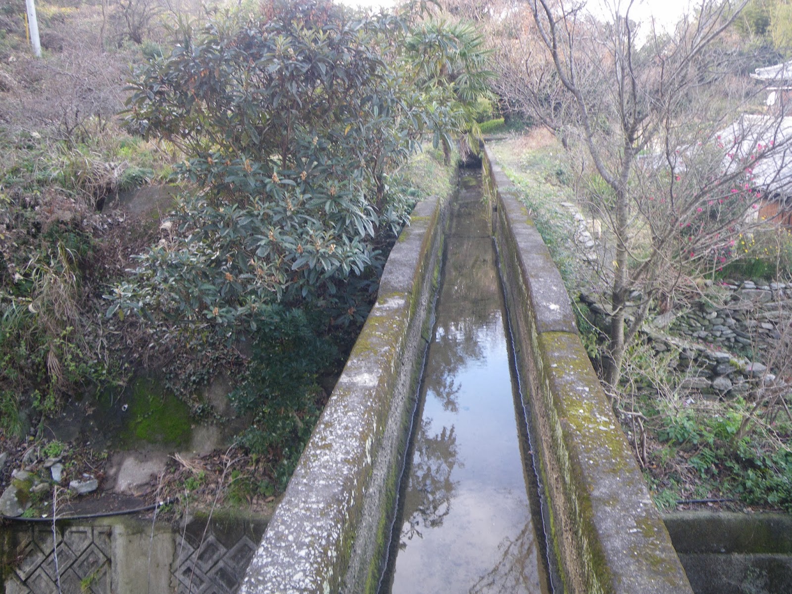 馬瀬谷川の疏水構造物らしきものがある辺りから一筋下の道を右に折れ、少し坂を上り直すと、お屋敷の手前の石垣に沿って開渠が見えた。