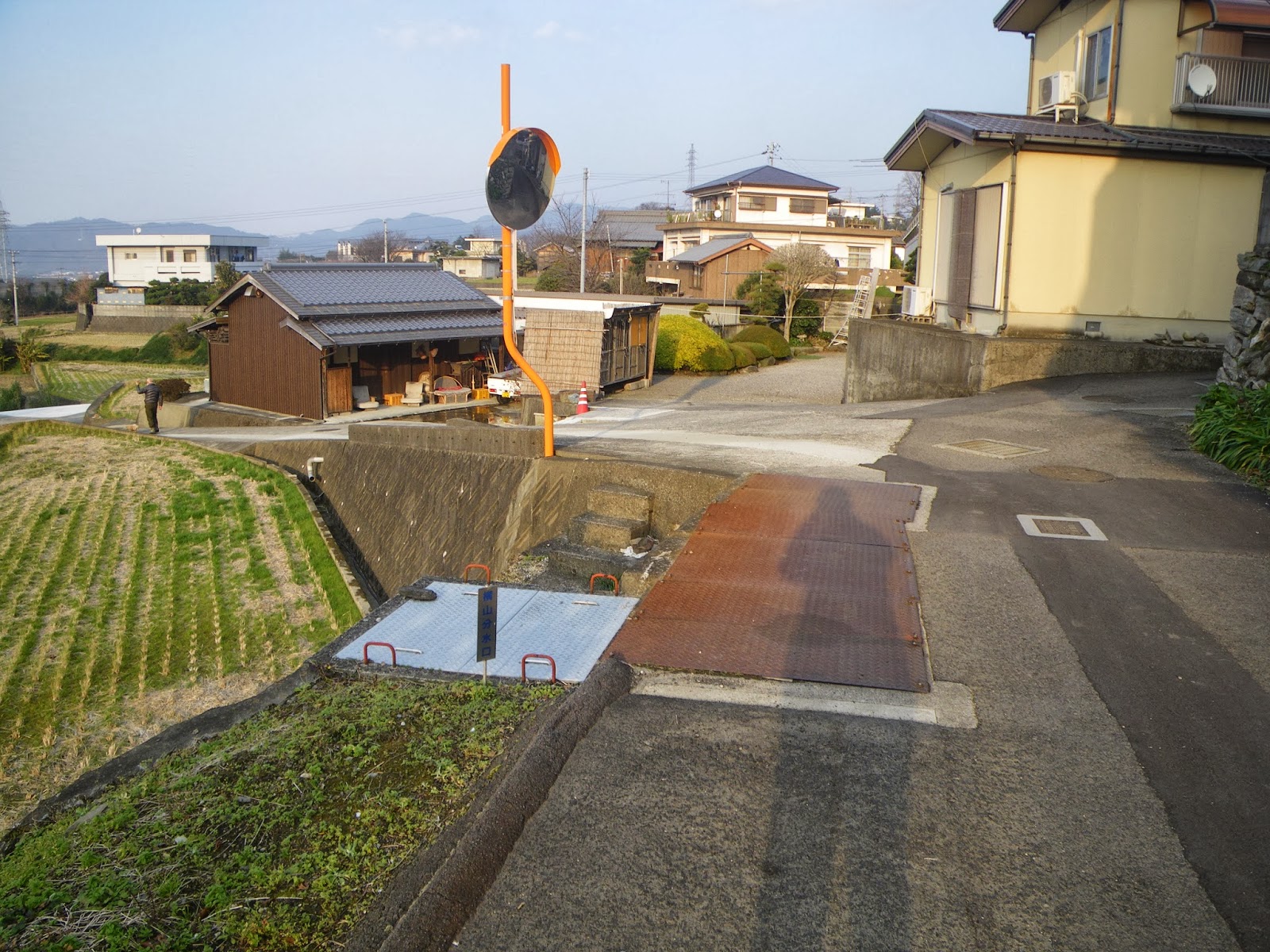 三叉路の先は民家があり、その先には川筋がある。地中を進む水路は川筋で何らかの手ががりがないものかと、道を進む。