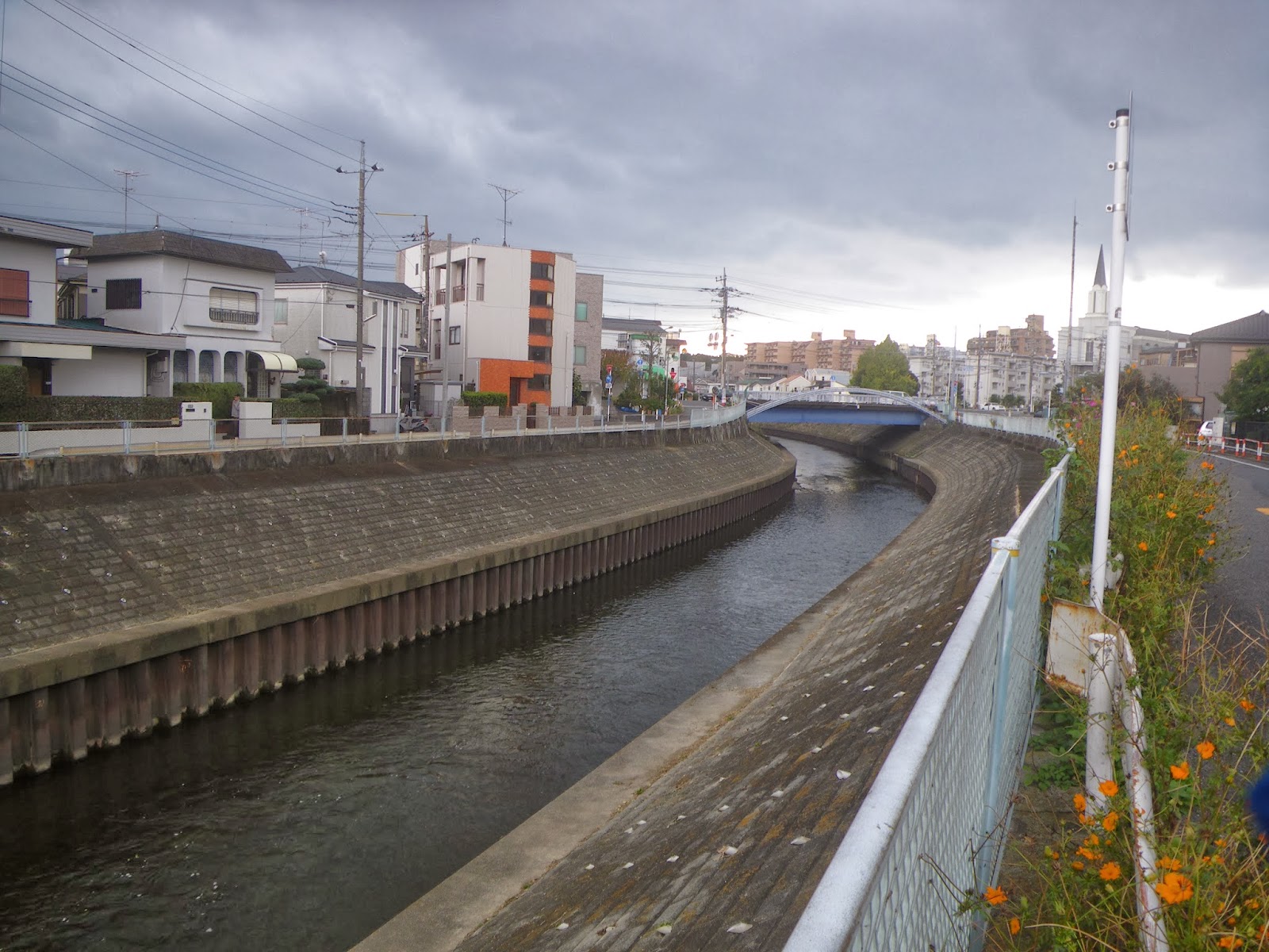 国道をクロスし国道6号に沿って道を進むと根古屋川。周囲の低地は根古屋川によって開析された谷戸の景観が楽しめる。根古屋という地名は散歩の折々に出合う。山麓に城郭をもつ城の家臣団が住む山裾一帯を「根古屋」または「根小屋」と称するわけだが、道の左手に見える台地一帯が牛久城址のようである。