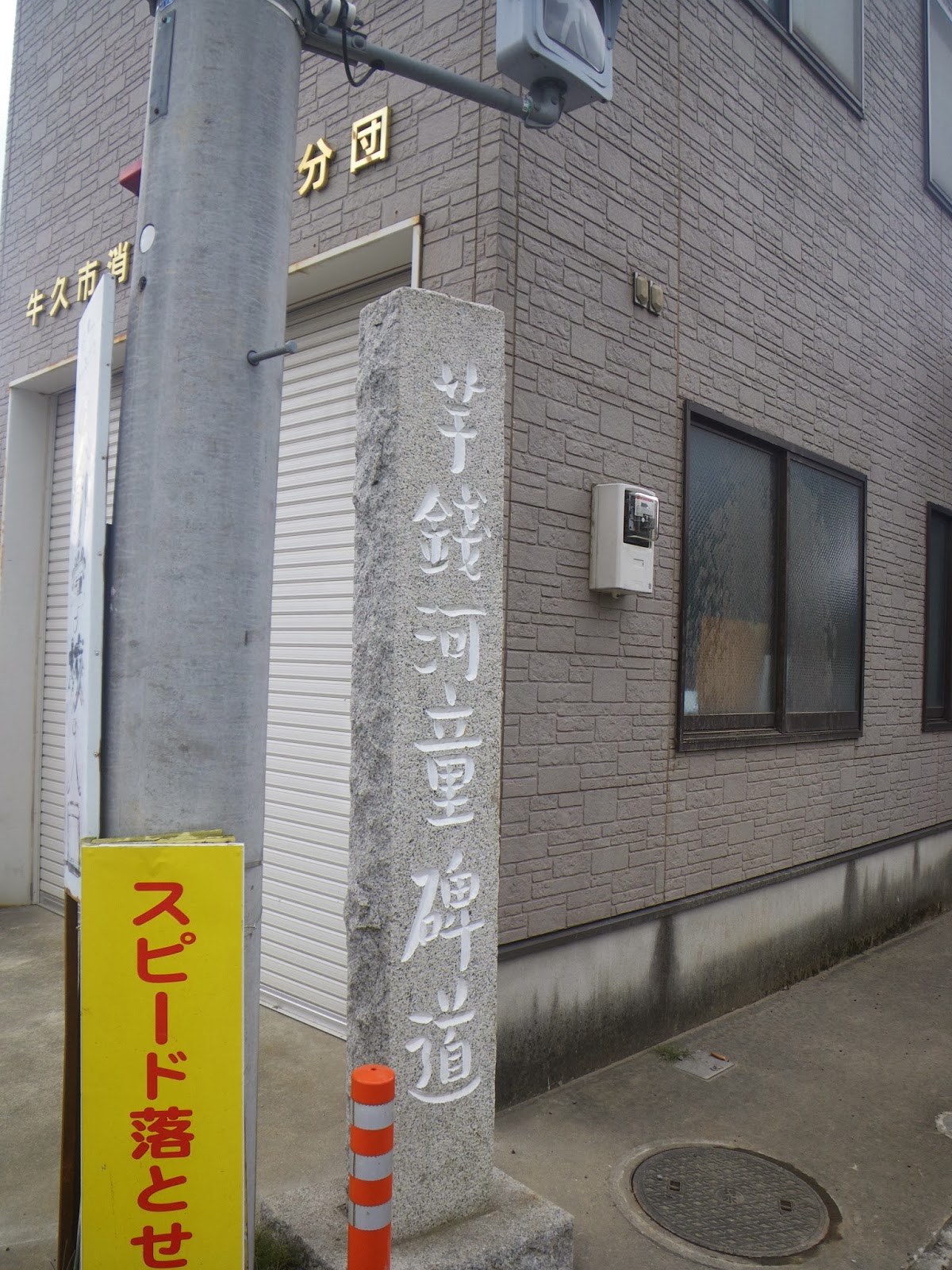駅から水戸街道の道筋まで戻るため県道5号・訓柴小交差点に。取手宿から藤代宿を経て進む、水戸街道の道筋は、この交差点から西へと向かう。交差点脇に誠にささやかな屋根付き西碑。「右 りゅうがさき なりた 左 わかしば」と刻まれているとのことだが、摩耗し全く読めない。