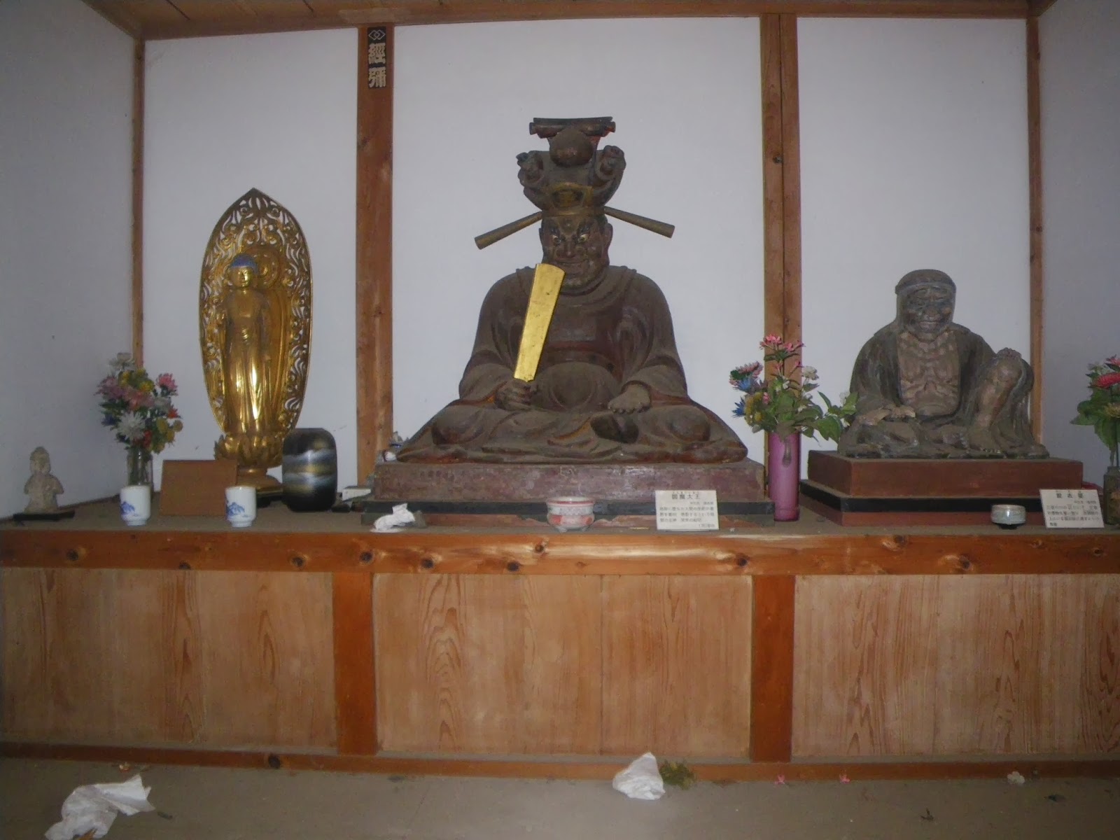 大手門跡一帯は城跡の面影はなく、普通の民家が連なる。先に進むと道の左手にお寺さま。曹洞宗の古刹である稲荷山得月院。山門をくぐり本堂にお参り。境内には閻魔堂。左に阿弥陀に如来立像、右に奪衣婆坐を配し中央に閻魔様が拝観できる。案内によれば、「得月院閻魔堂 牛久市指定文化財 木造 閻魔大王と奪衣婆坐像;地獄界の王閻魔は、死者を裁く十王の中の第五の王で、死後五七日(35日目)忌の裁判に当たる。死者の衣を奪う奪衣婆(だつえば)は閻魔の妹で、閻魔と対をなしてよく造像されている。この閻魔の首柄には宝永4(1707)年の墨書銘があり、奪衣婆も同時期の作と思われる。当地方にはこの類例はなく、閻魔の大喝し悪を懲らしめる造形も良好で、貴重な文化財と言えよう(牛久市教育委員会)」とあった。