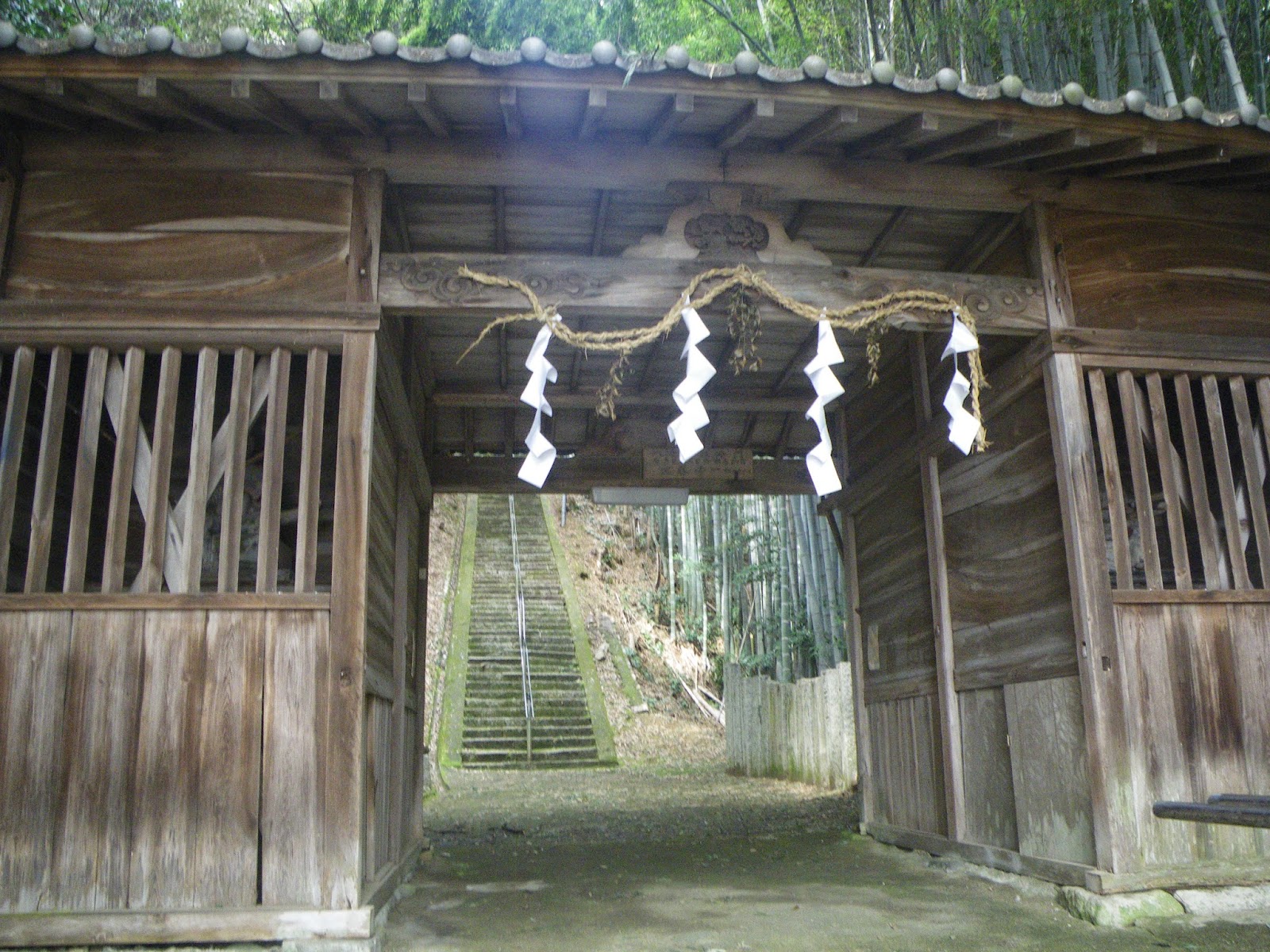 旧千原小学校の校舎下に立派な社。五社大明神とある、祭神は素盞鳴命(すさのをのみこと)、保食命(うけもちのみこと)、稚日女命(わかひるめのみこと)、伊邪那岐命(いざなぎのみこと)、伊邪那美命(いざなみのみこと)。稚日女命は、日本書紀では天照大神の妹とされ、高天原で織折りをしているとき、素盞嗚尊が馬を投げ込み、それが原因で亡くなってしまう。それを悲しんだ天照大神が天岩戸に隠れたとのこと。古事記には登場しないようである(Wikipedia)。境内にはムクノキ・イチョウ・ハナゴの巨樹が残る。