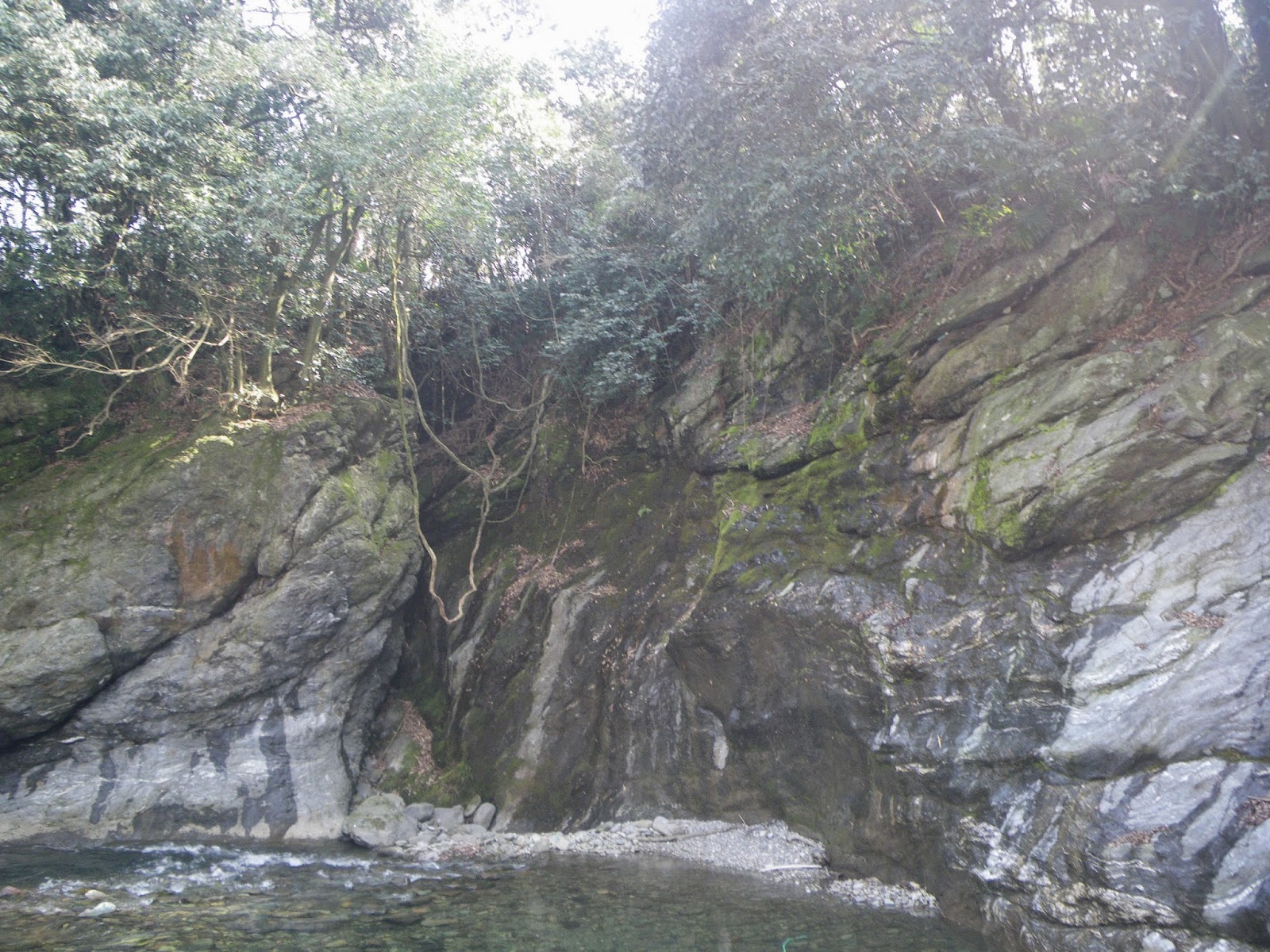 それはそれとして、神社にお参りし、車を神社脇に置き先に進む。と、行く手は採石場で立ち入り禁止。その先にも田滝川に注ぐ沢があるので、「ウルメ沢」の景観を求めて、川床に下り逆側の土手を進む。田滝川の堰堤は連続して続くが「西条市観光情報 ふるさと探訪76」に掲載された写真と比較すると、ちょっと新しいように思う。採石場の先でふたつに分かれる沢を確認するも、これといった趣のある堰堤群に出会うこともなく、結局引き返す。とっくに「ウルメ沢」に出合っているわけだから当然のことではあるが、その時は繰り返すが、知るよしもなし。