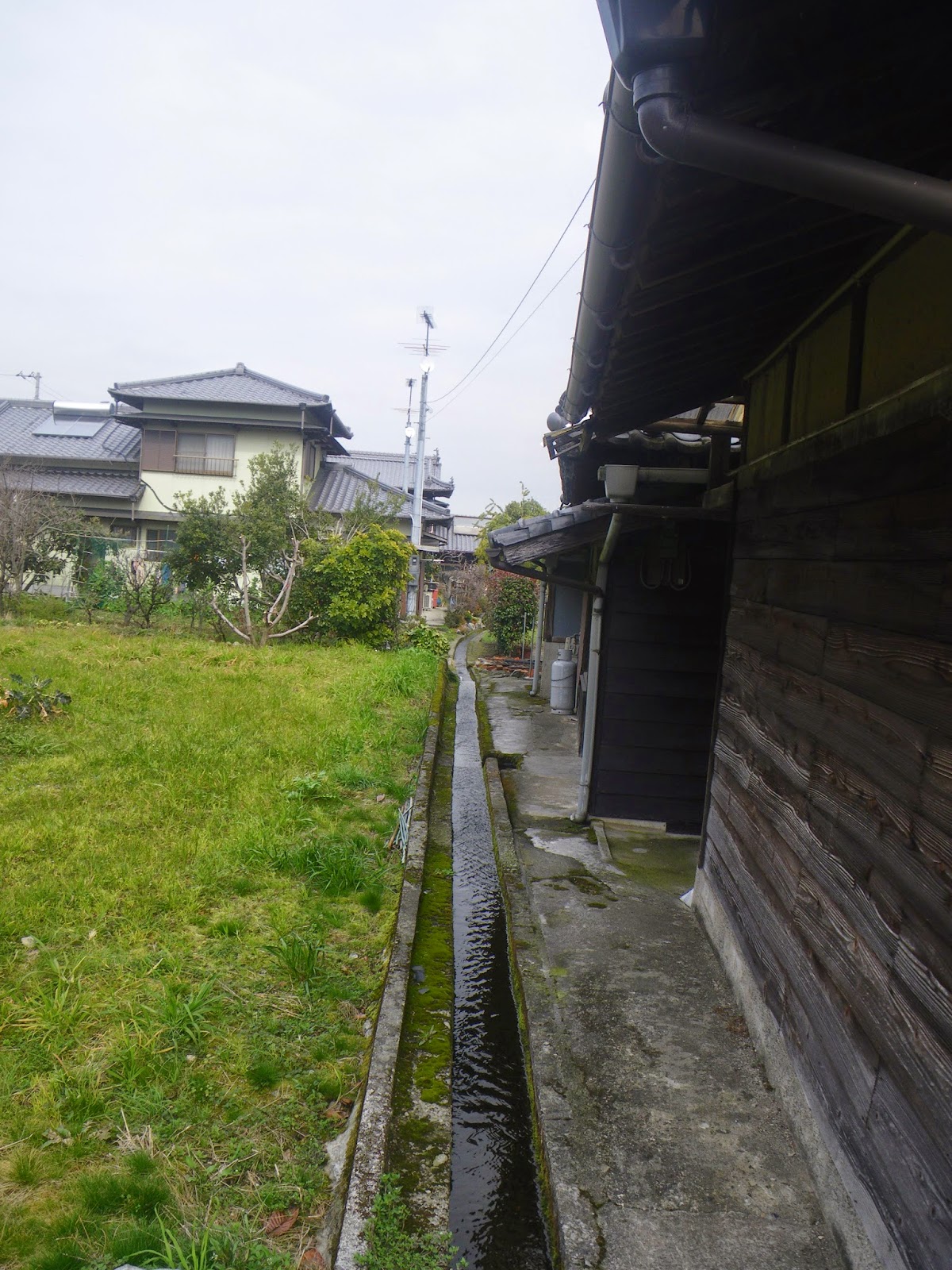 水路に沿って下ると萬福寺の境内前。そこから更に傾斜のある耕地を水路に沿って里に下り、今度は隧道入口探しに出かける。