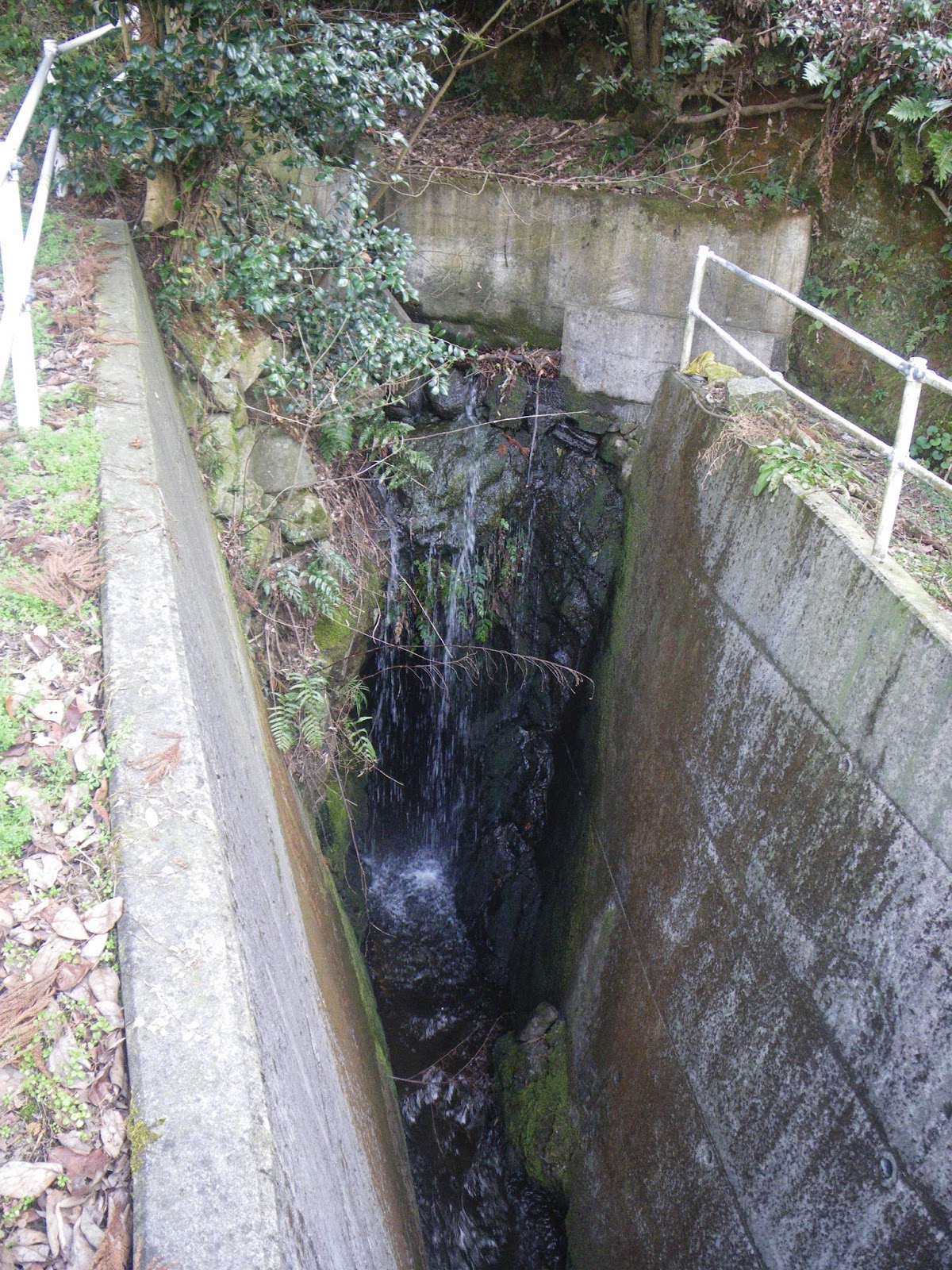 車を食堂脇に停め「庄屋井手」探しを始める。「丹原町の文化財」の説明に「自動車道の傍」ということである。道路の山側を注意しながら進むと、食堂から西に進み最初のカーブの先、コンクリートの壁面が切れて鉄の柵になるところに、人が辛うじて入れるスペースがあった。なんとなく「ノイズ」を感じ、鉄柵の中を進むと水路があり、朽ちた蓋のある分水口も現れた。これが説明にある「庄屋井手」の水路ではあろう。