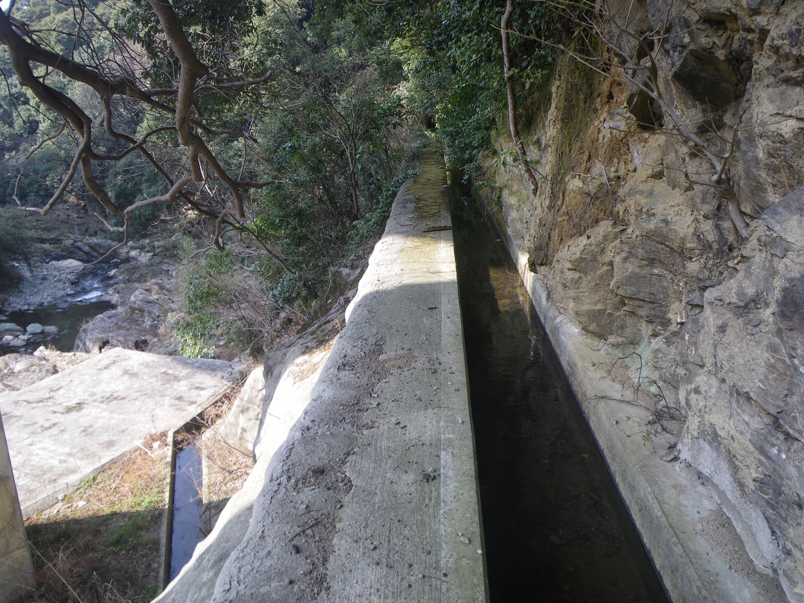 隧道出口からの水路に沿ってふたつの沢を横断し先に進む。水路はさきほど歩いてきた道に沿って進み、その比高差が次第に減ってゆく。そしてしばらく進むと水路が道とクロスし、そこからは水路は山側に移る。ここを歩いてきたのだが、全く気がつかなかった。