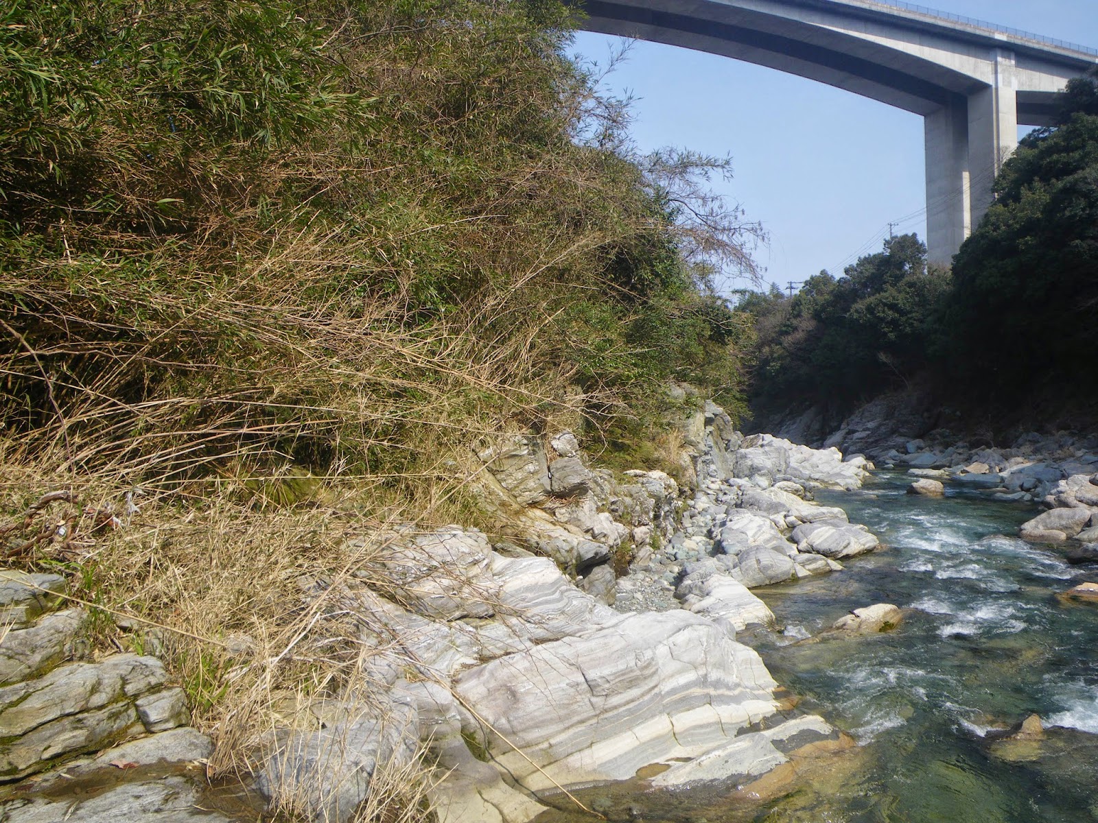 利水の史跡ではないが、丹原の史跡として知られる衝上断層を見るため、中山川水管橋から来見橋まで戻る。橋から下流左岸を見ると、いかにもそれらしき地層が見える。近くから見てみようと橋の右岸から下り口を探し、川床に。