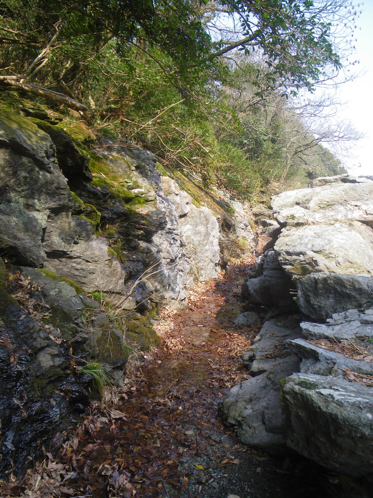 道標の案内に従って下り水路を北に戻り隧道入口へと向かう。岩壁に近くなるにつれ水路はコンクリートで固められている。隧道入口で先は岩壁に遮られ進むことはできない。再び水路を折り返し、車道に戻る。